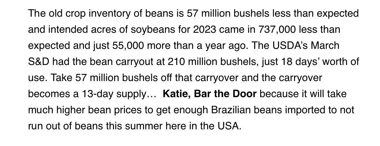 I think the USDA printed numbers last week that helped keep panic from becoming side spread for food shortages. Because the reality is if we only get 90 million acres and we get some hiccups in production and yield like I think we could we open the price possibilities so high that we could break several elevators via margin calls and interest.