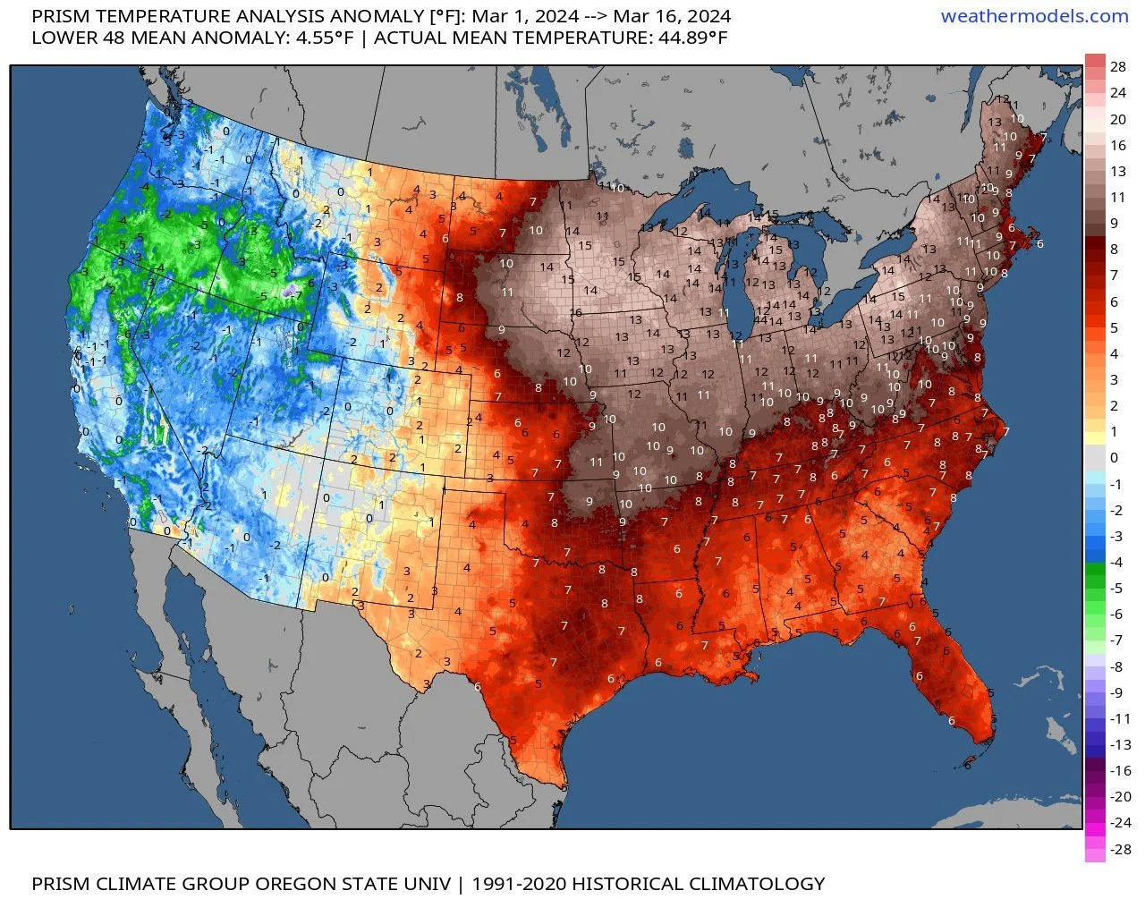 The 1st map is the temp anonomly for the first 2 weeks of March. Far warmer than normal.