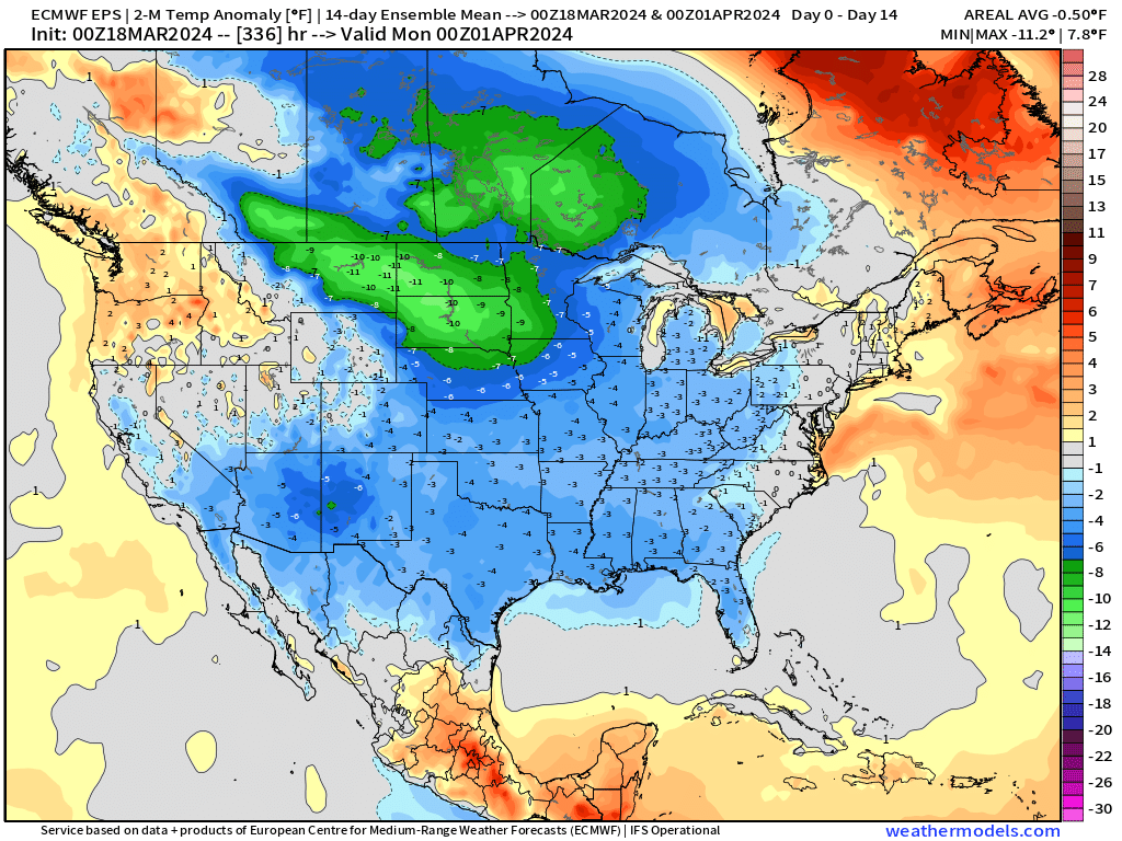 The 2nd map is the temp anomaly forecast for the next 2 weeks. Colder than normal.