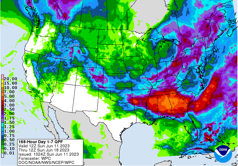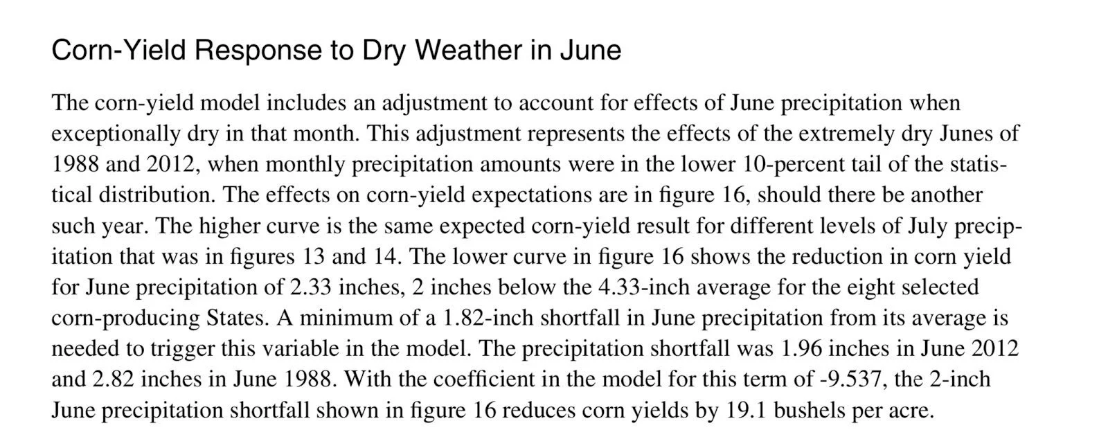 To sum it up, our July yield decrease came from very dry June weather. The article correlates a 2 inch deflect in precipitation in June for the 8 state region equals about a 20 bushel per acre yield decrease from yield models.