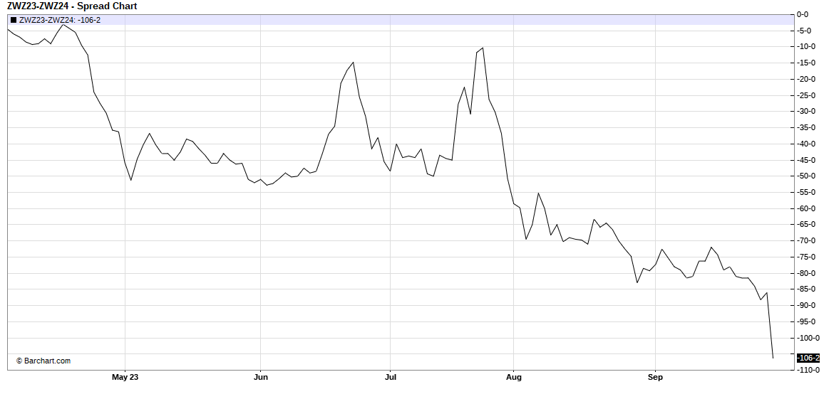 What is the biggest difference between now and a few months ago? It is the carry in the wheat market. Look at the below chart with Dec 2023 versus Dec 2024. Look at the price movement on Friday. Dec 2024 gained nearly 20 cents on the nearby contact.