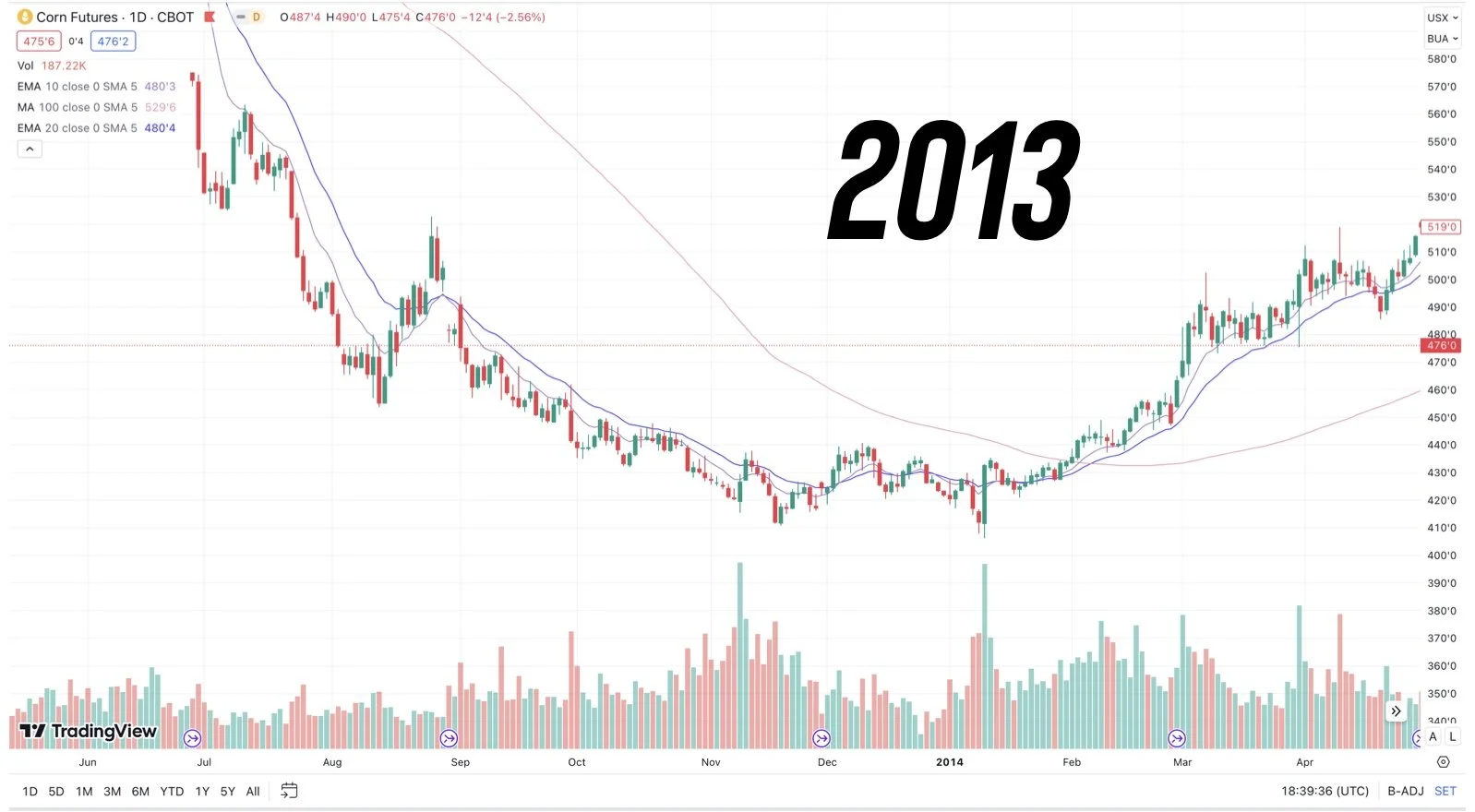 2013. If we take a look at the price action in 2013 for corn, prices continued to trickle lower the entire year before finally rebounding in the spring.
