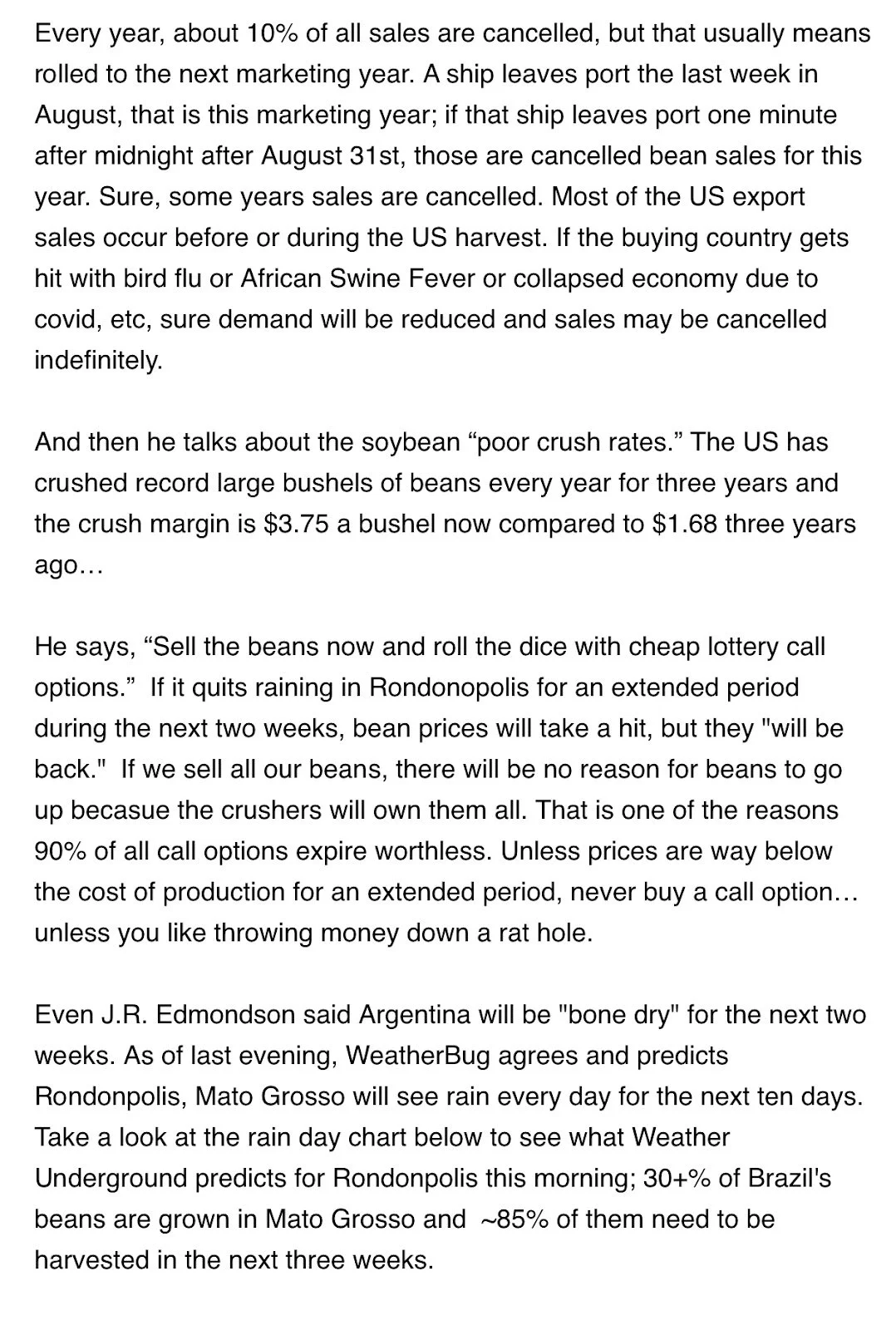 On my radar remains buying bean meal puts. But I need to see some trigger, I think for me that trigger would be seeing the SAM crop size stabilize and the weather maps I am looking at don’t indicate that we are doing that in Argentina, nor do they appear that Brazil will be planting corn in a timely manner.