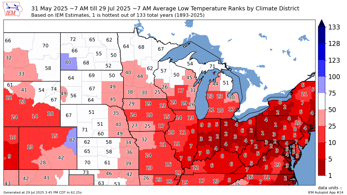 Here is the overnight temps ranks from June 1st through now for this year.