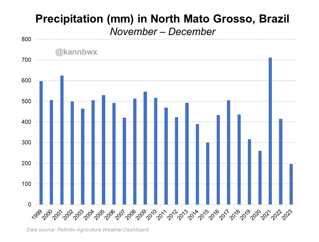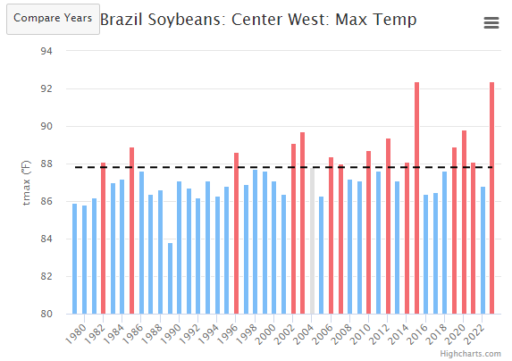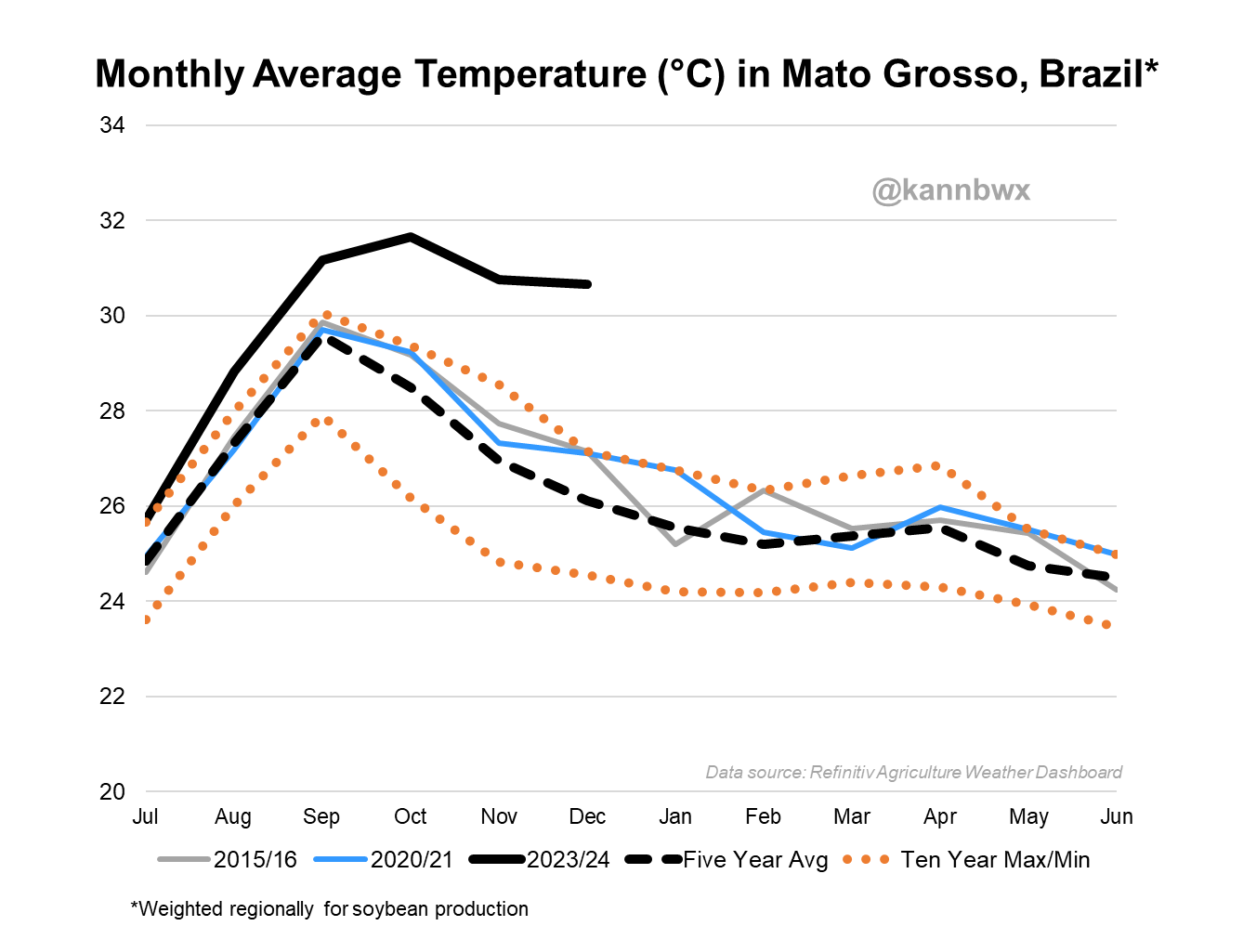 Here is a chart from Arland Suderman of StoneX. It showcases just how brutally hot 2023 was for central Brazil.