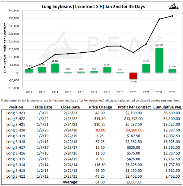 It displays the fact that March soybean futures have rose 11 of the past 12 years (which is 92% of the time) for the 35 trading sessions starting on yesterday’s market close. With the average rally being +61 cents.