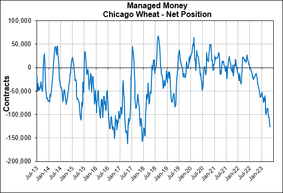 Friday's commitment of traders showed some massive selling. Where it showed the funds are short over 100k contracts of corn, on one of their largest net-selling weeks in history. While the funds approach a near record short position in Chicago wheat. One has to imagine if we get some additional weather scares this could lead to more short covering. The big question is, do they really want to be that short going into growing season and with plenty of wild cards left in the deck?