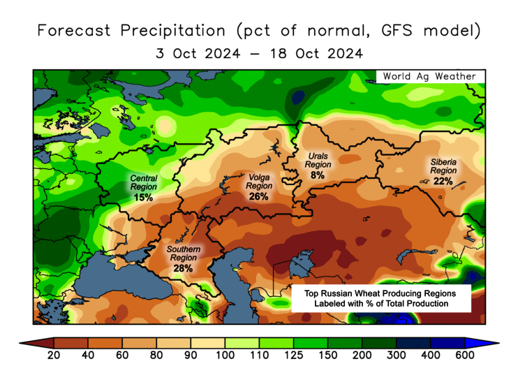 It is still early, but Russia has only received 26% of normal rain the past month. Altough Ukraine has received 79% of normal rain.