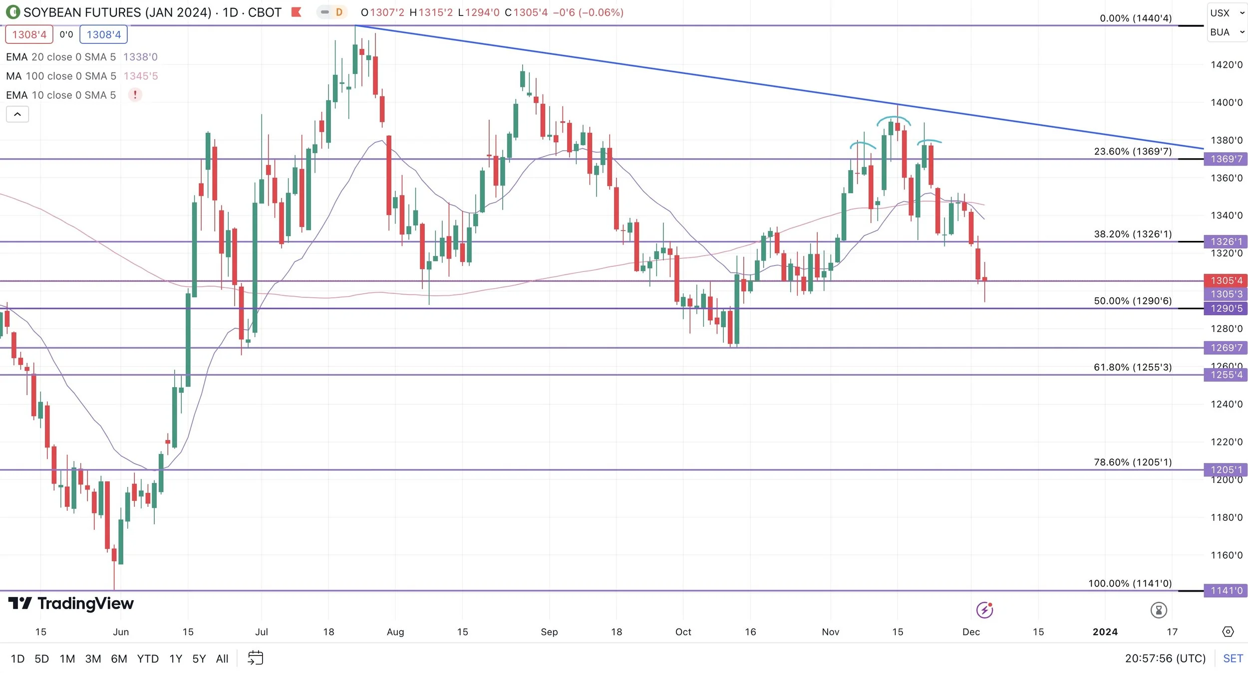 Overall a pretty solid day on the charts for beans in my opinion. Printing a doji candle on the chart as we found support above the 50% retracement to the downside from our $3 rally from May to July ($12.91 which is a big support) and we crawled back above $13.05. Bulls want a break above $13.26 to see more upside.