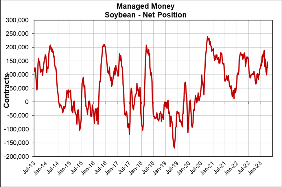 The past two weeks the funds have built a long position in corn following three weeks of selling where they had became net sellers. Last week funds bought nearly 5,600 contracts, increasing their long position to 27,100 contracts. To put things into perspective and to anyone wondering just how big of a position the funds can actually build, two years ago they were holding over a 400,000 contract long position.