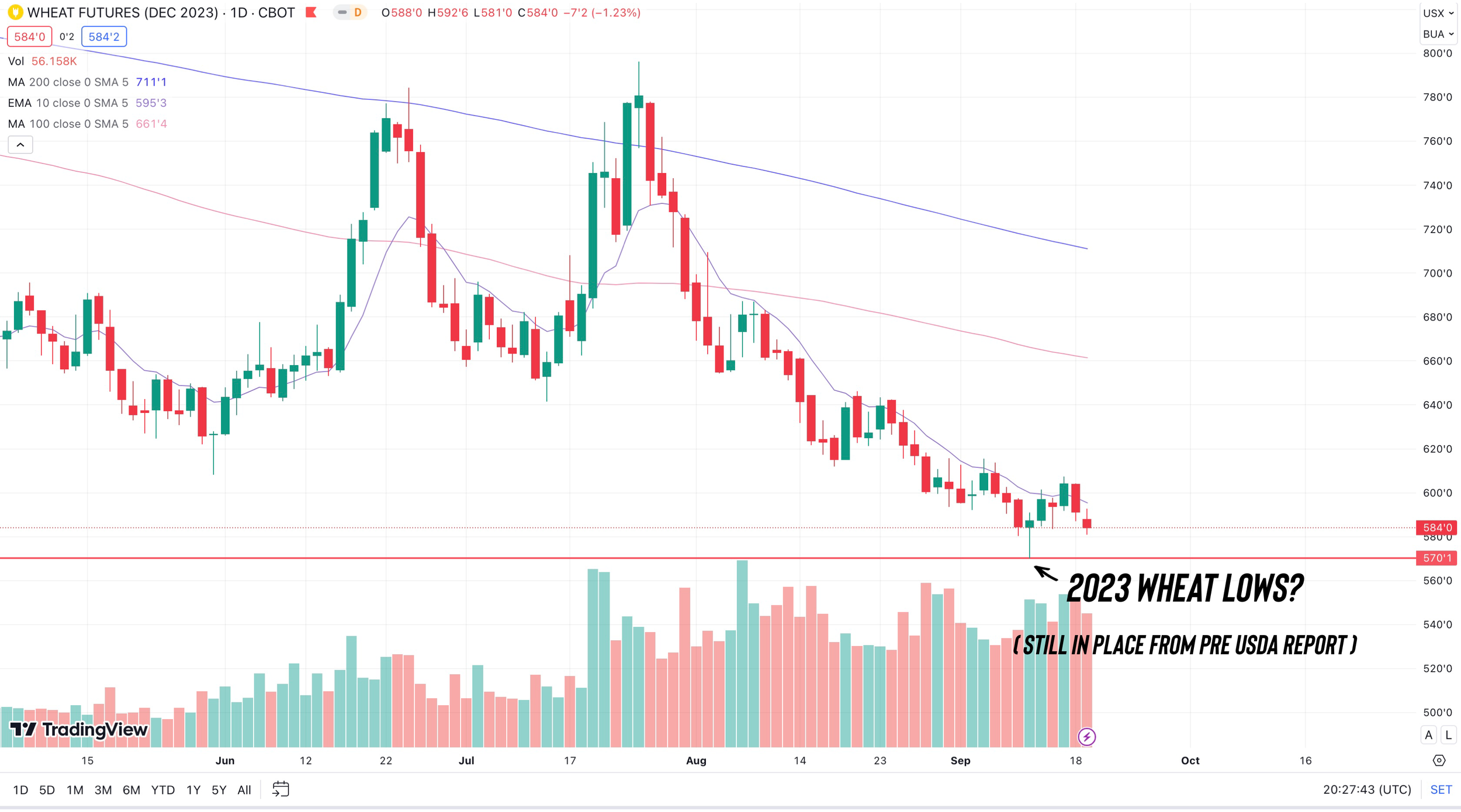 Chicago trades lower for the 2nd day in a row, but we have still managed to hold those lows we talked about last week from the USDA report. We still believe there is a good chance Chicago made it’s lows ($5.70) Closed today at $5.84