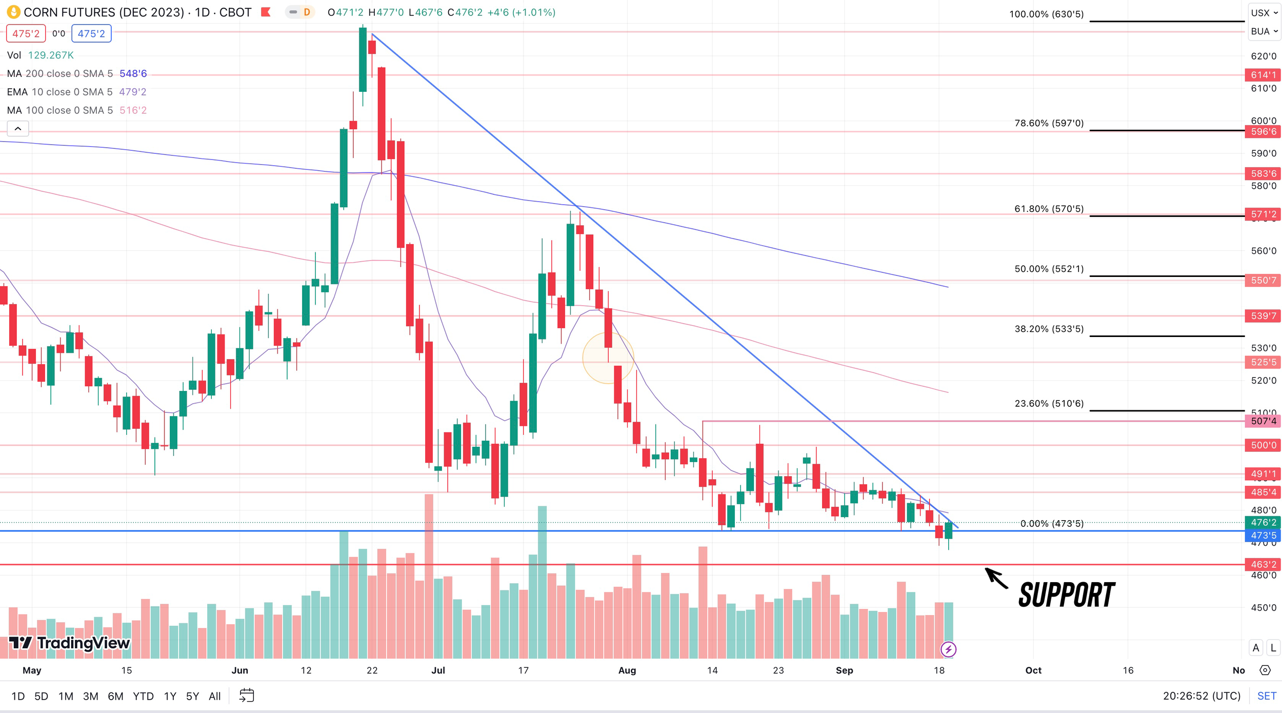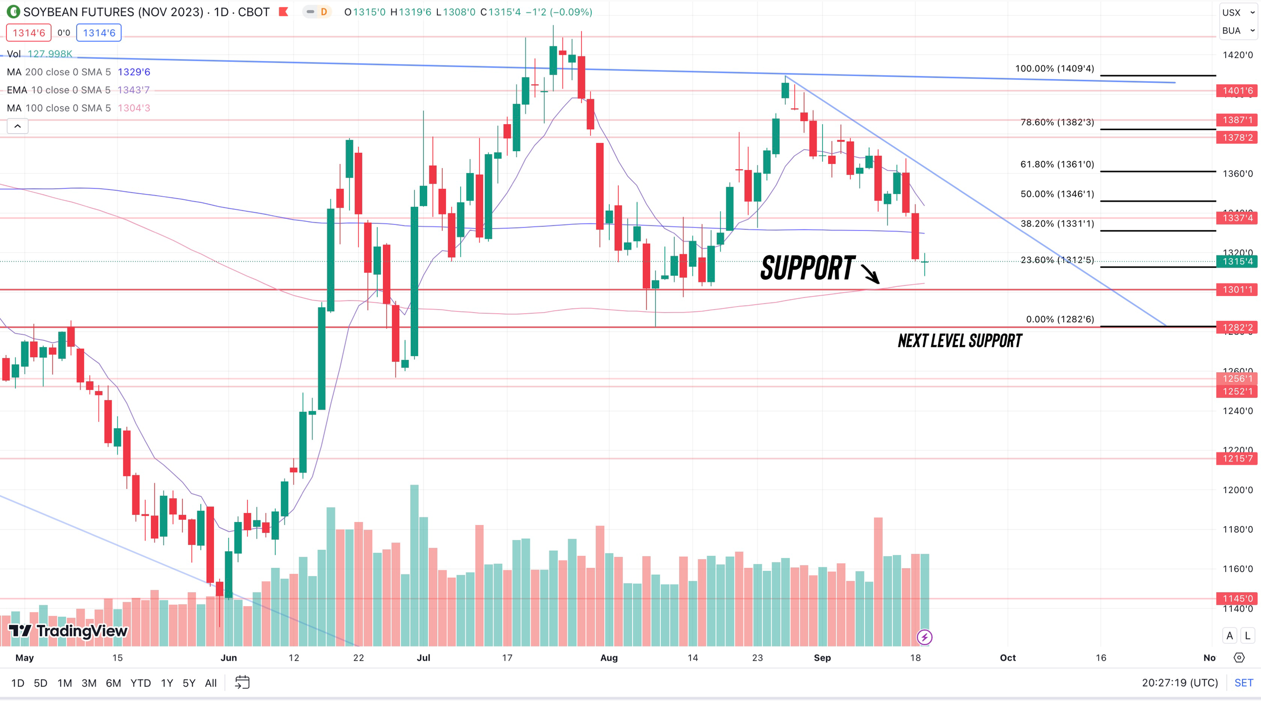 Beans closed right at that 23.60% retracement level. Bulls need to hold $13.00 or we could very easily test $12.82 (our August lows).