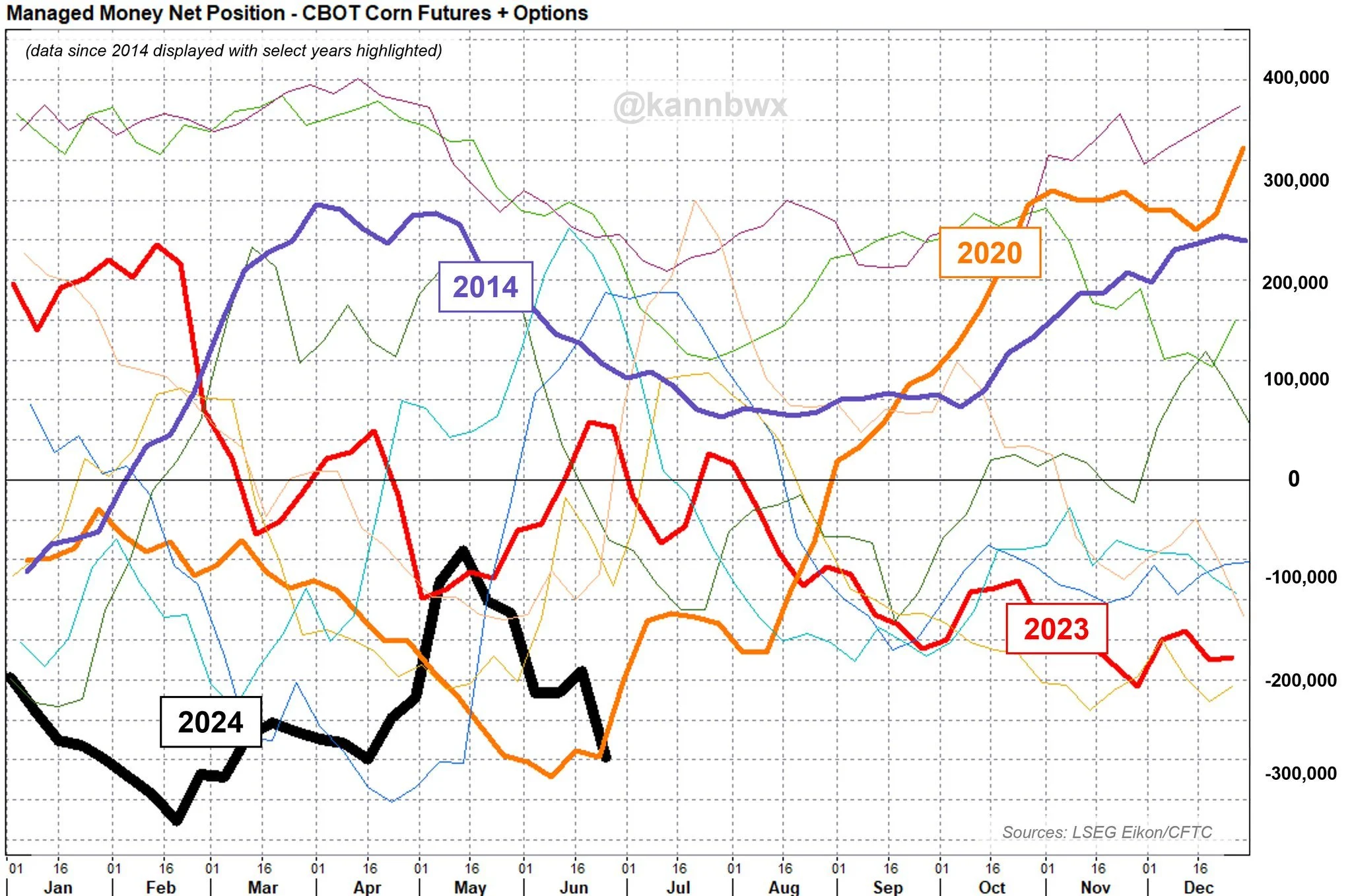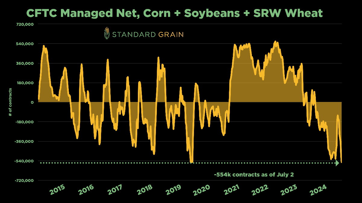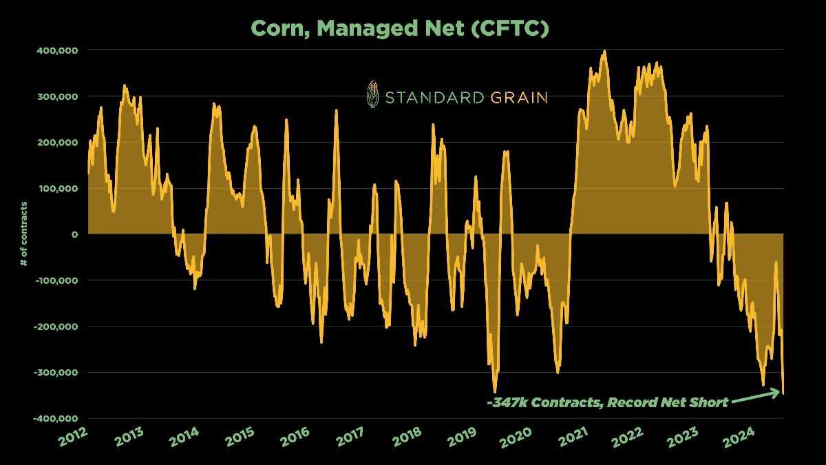 The funds are short 350k contracts (1.7 billion corn bushels)