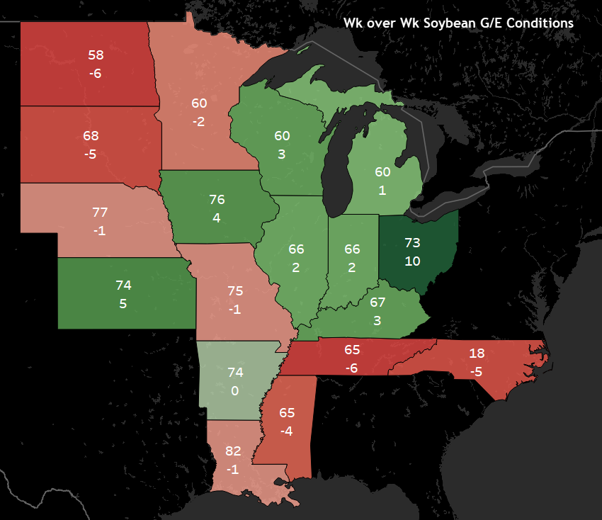 The trade was expecting no changes from last week, but both corn and beans improved +1%.