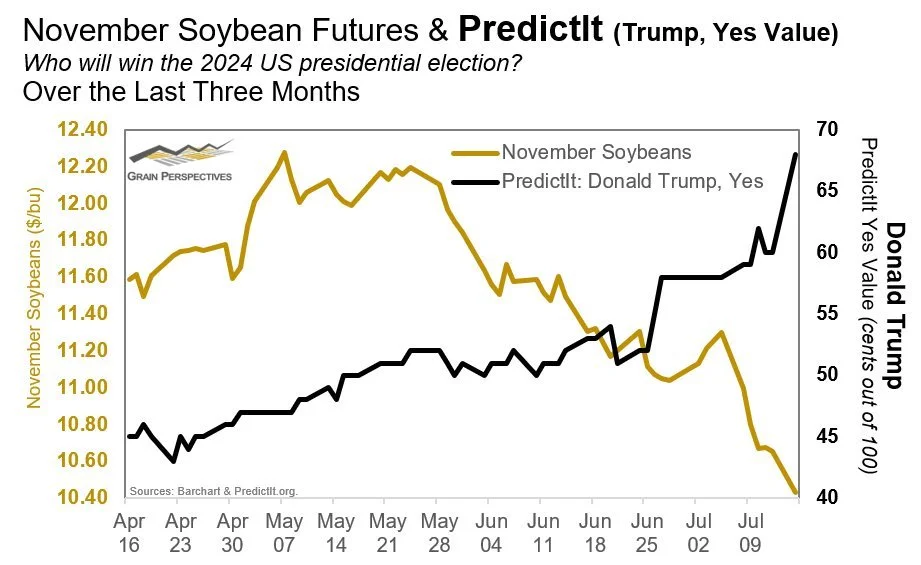 The big news surrounding soybeans has been the "trade war" talks. As everyone knows Trump survived an assassination attempt over the weekend. This skyrocketed his chances of being elected to 80% or so.