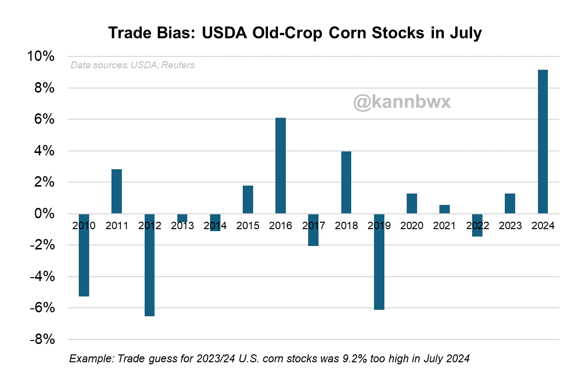"I could see Dec corn trading between $4.00-$4.40 for a while even if yields & stocks move lower. Without demand, weather, or macro issues a 1.7-1.8 carryout is still a decent amount and probably won’t warrant $5 board. Basis will have to continue to do the heavy lifting well into fall/winter. Dec-25 should have already been on the radar but must be on the radar now. Some beautiful inverse spreads the last couple months for next year have provided some great opportunities already that have turned into carries now. I don’t think the funds get scare until a close above $4.46. Watch the spreads."