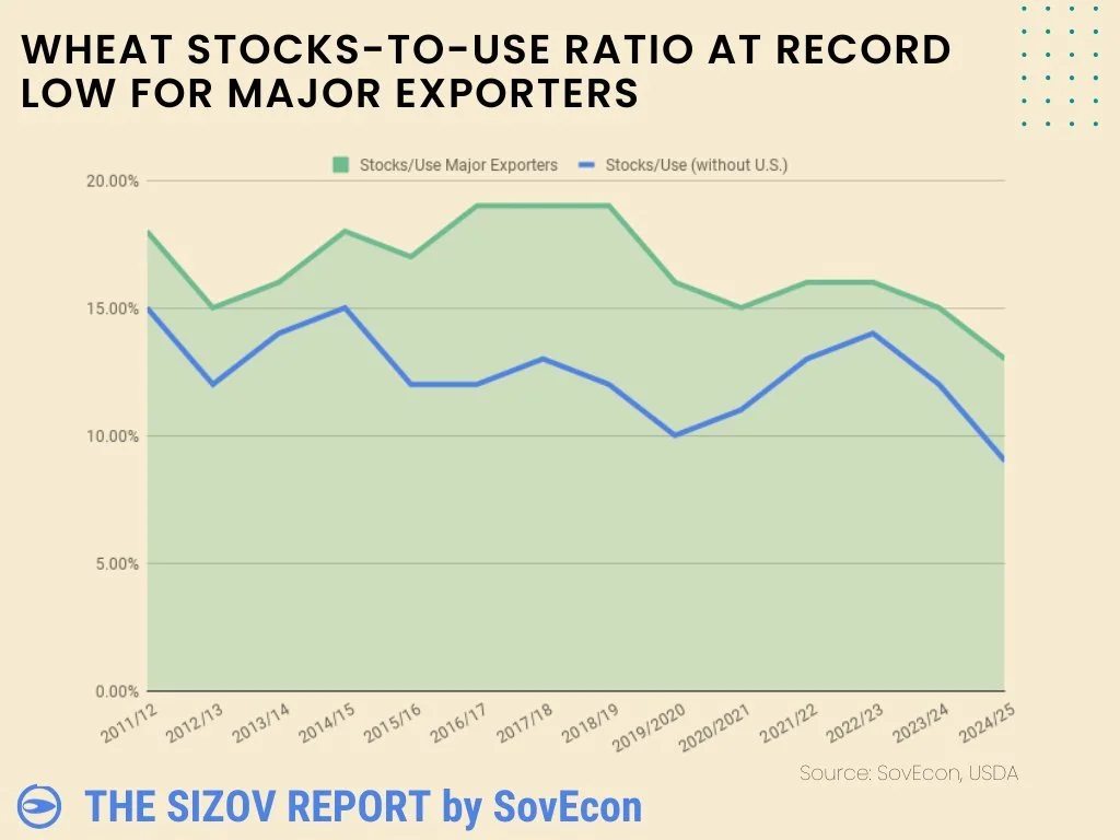 Here is a chart from Aundrey Sizov that shows wheat stocks to use ratio from major exporters.