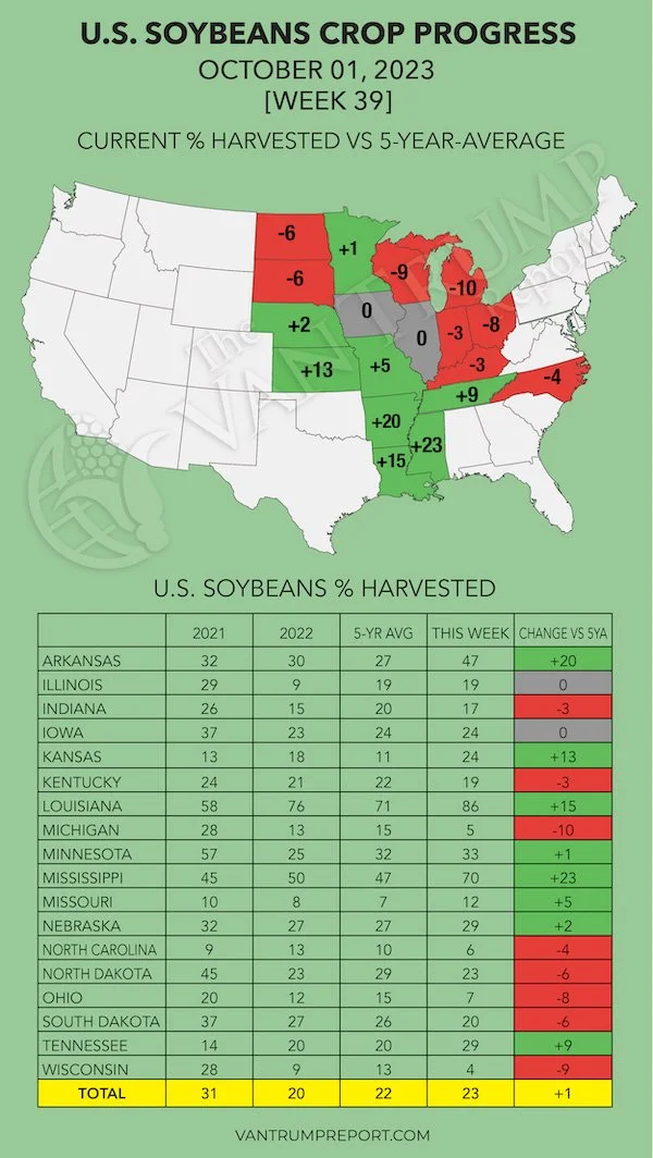 Harvest is 23% finished, slightly ahead of our average. So far, southern states such as Arkanas and Mississippi are running far ahead of pace and have been showing some pretty decent yields thus far. Some data out east is also showing some good yields. With this, some are saying that the current estimate for the USDA's soybeans of 50.1 might actually be too low.