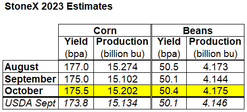 The October StoneX survey showed corn yield at 175.5 up from 175 last month. Their soybean yield was 50.4 bpa.