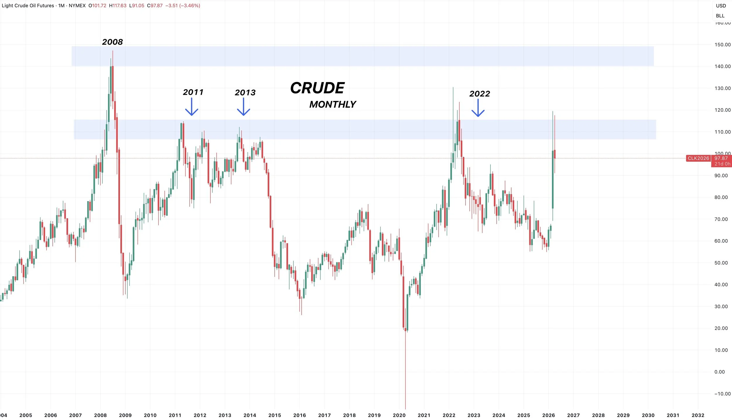 But what we do know is that crude is sitting right at some multi-decade resistance levels. Where it failed time and time again.