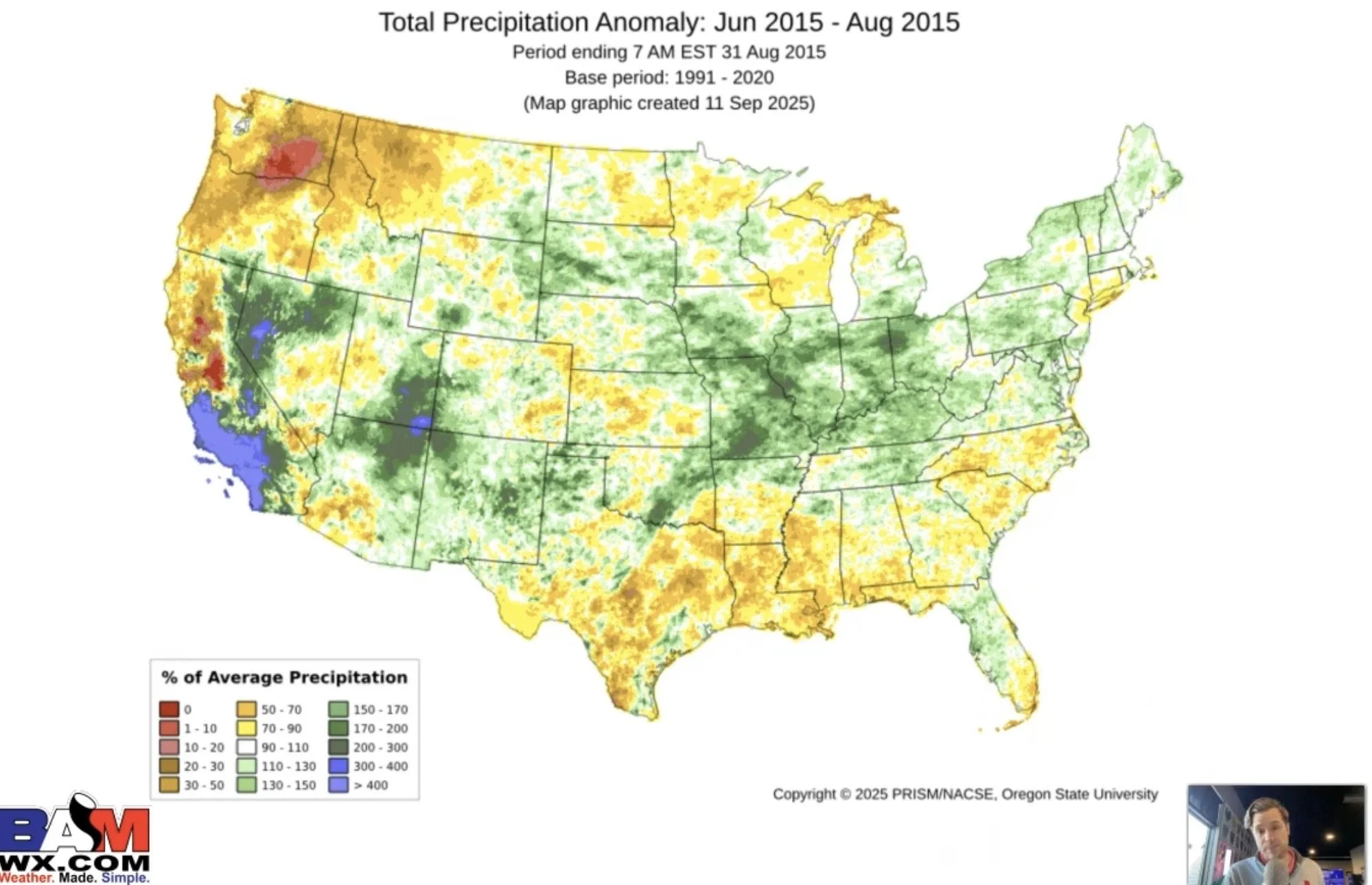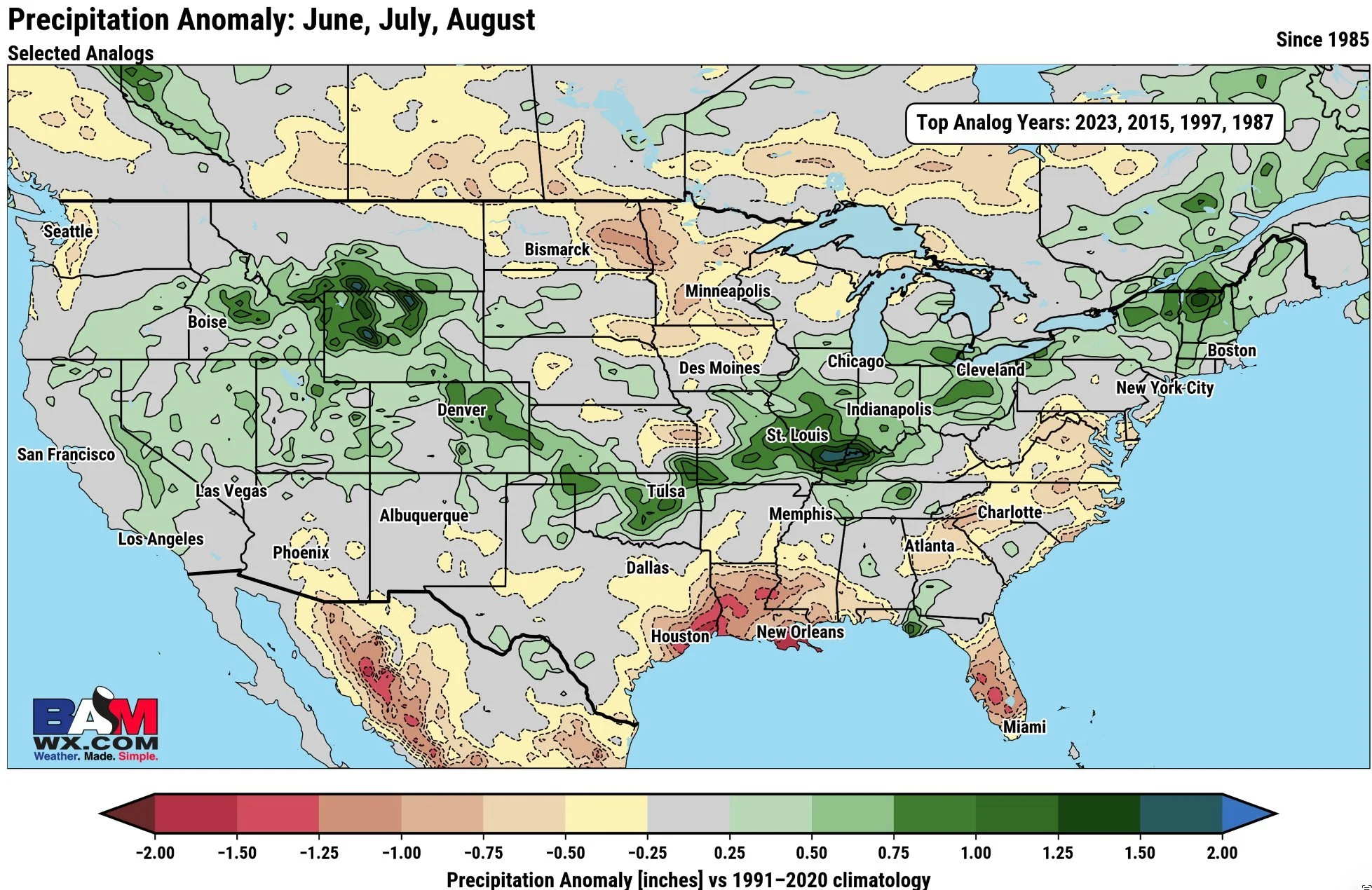 Here is a map from BAM Weather that show cases the past El Niño years, and how precipitation fell from June to August.