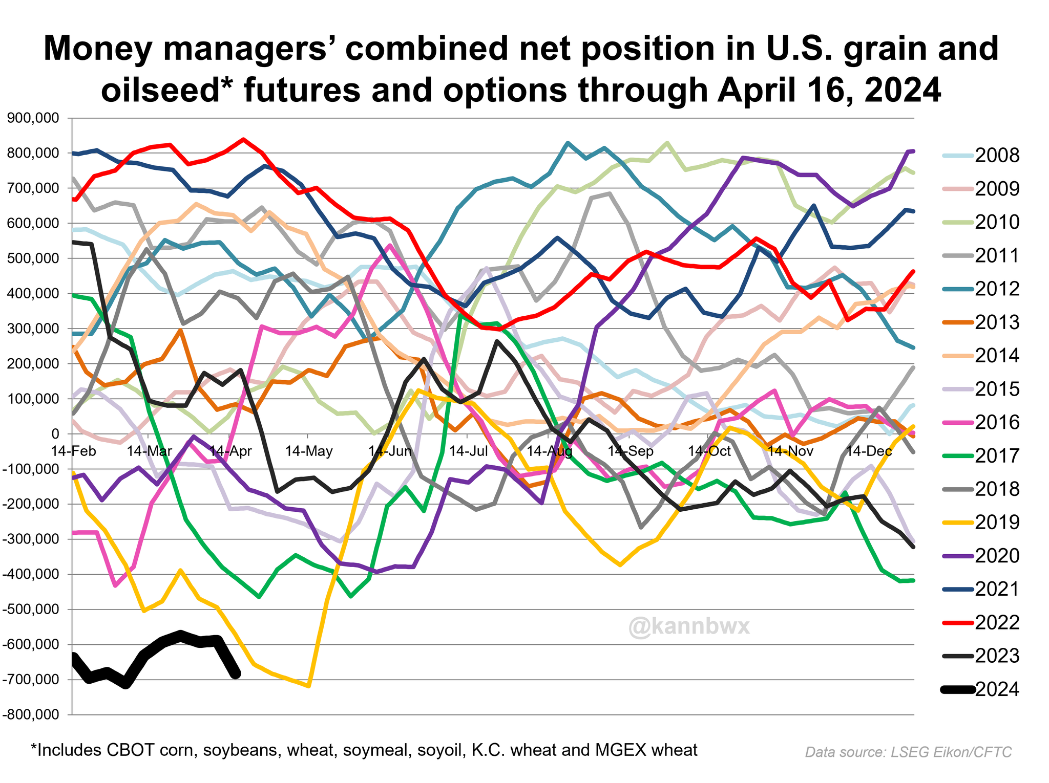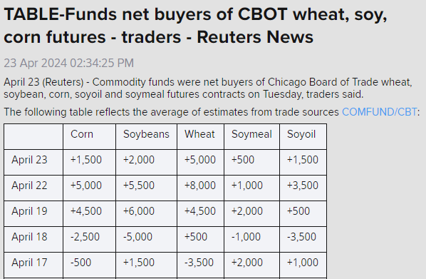 Funds continue to cover their shorts. But as I mentioned earlier, the funds position since February hasn’t been as poor in soybeans as it has in corn and wheat. So perhaps there is not as much incentive to cover beans as their is corn and wheat, because their bean position has still performed pretty given the fact that beans nearly posted new lows last week.