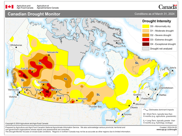 Another thing to watch is Canada. 82% of ag land in western Canada is in a drought. There are many areas such as SW Manitoba, N Saskatchewan, and N Alberta that have had less than 85% or normal precip the past 6 months. Something to keep an eye on.