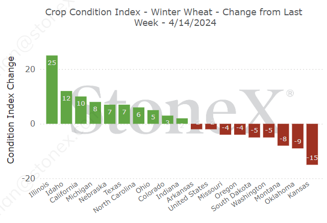 Illinois winter wheat ratings surged +25% from last week, but Kansas ratings dropped -15%.