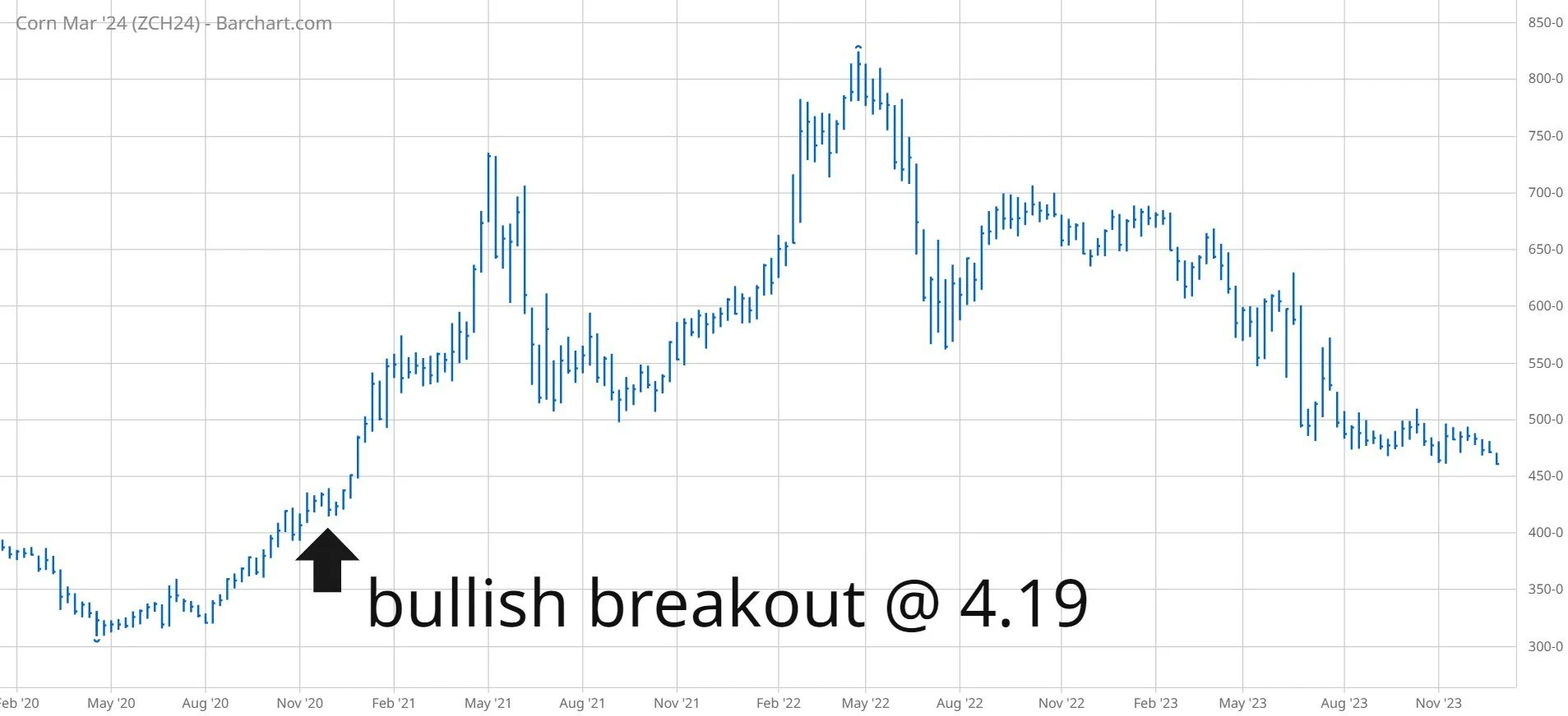 "Corn trading at lowest level in +3 years. Most likely, corn will drop to $4.19, which was the original bullish breakout during COVID. Corn will make an important low in 2024, followed by higher prices for the remainder of the decade."
