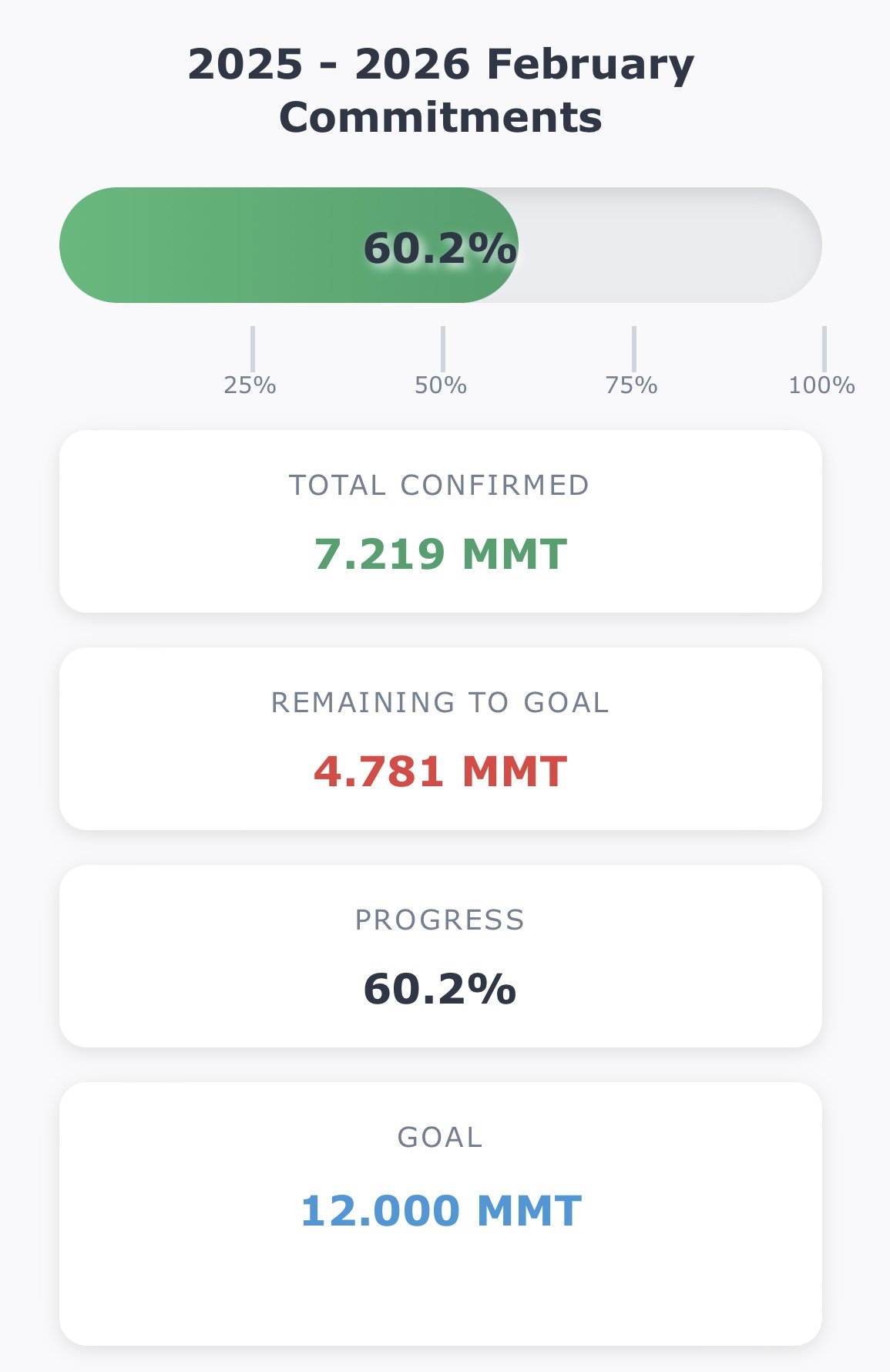 They've officially bought around 7.2 MMT, which is 60% of the 12 MMT goal.
