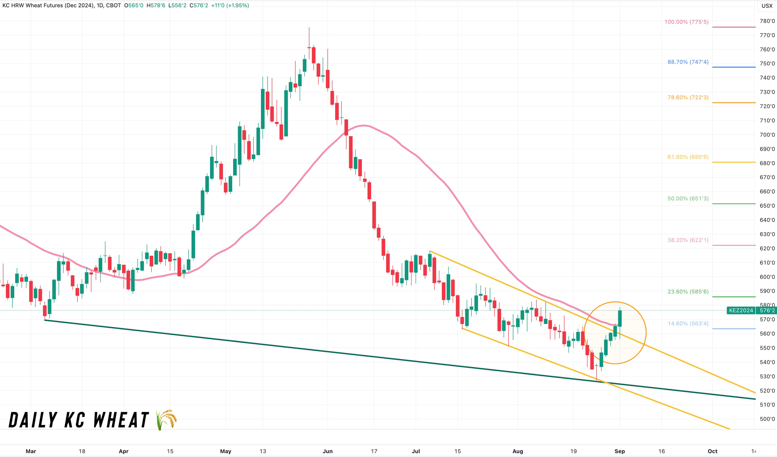 Feeling pretty confident the bottom is probably in, but we all know just how fast wheat can turn around either direction. Would still like a break out of this range (green box) and over $5.80 to be completely certain.