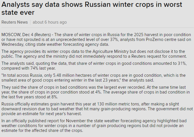 The reports say Russia's winter wheat crop is rated at 37% poor. Last year it was 4% and the average is 8% poor.