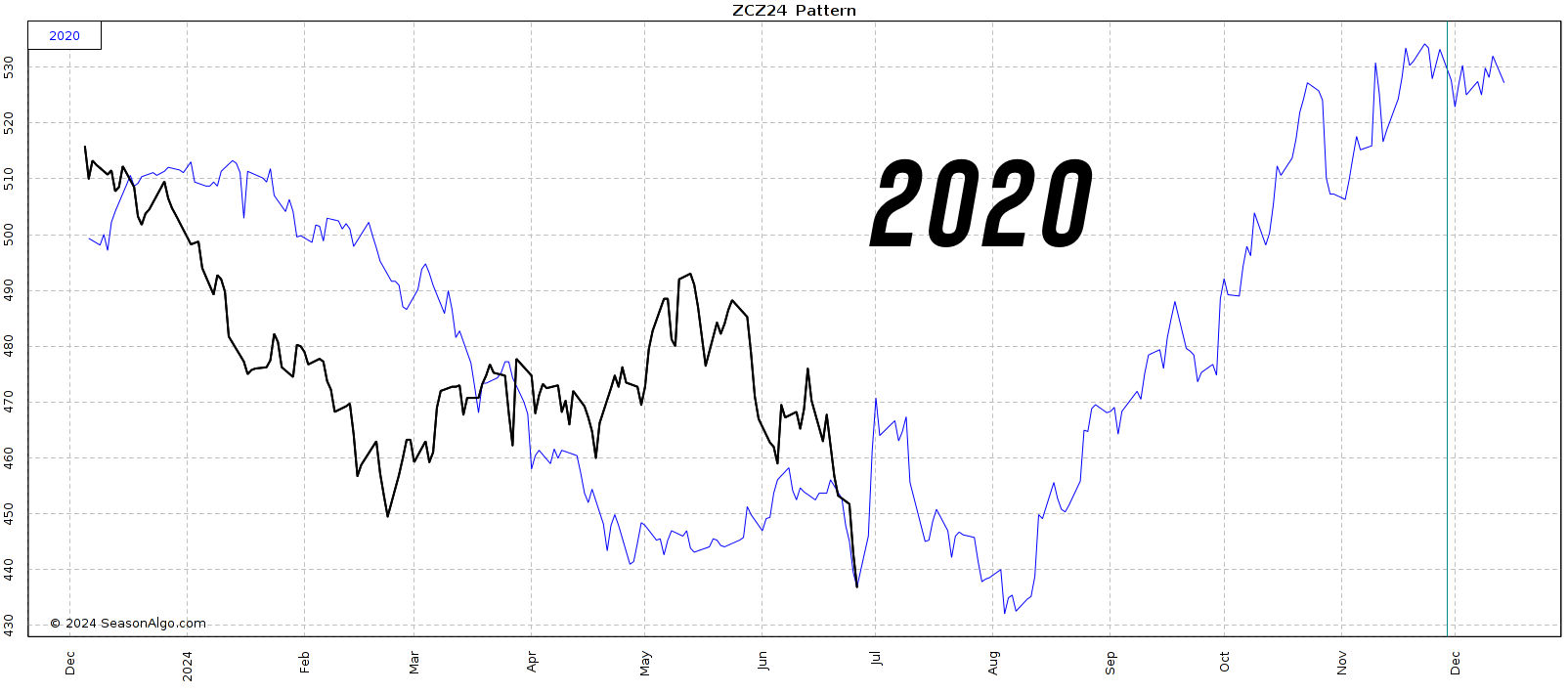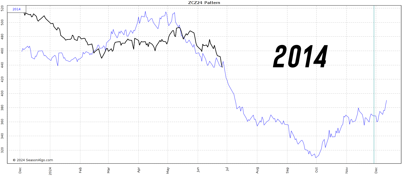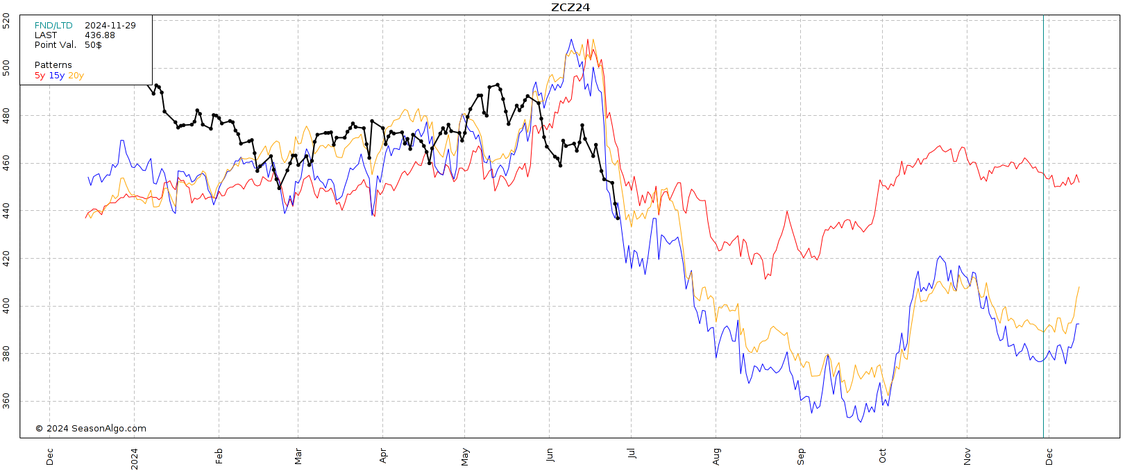 Here is Dec 2024 corn (black line) compared to the 5, 15, & 20 year patterns.
