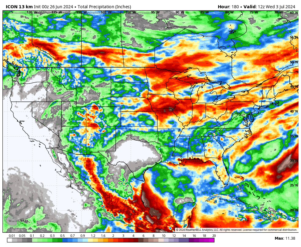 1.) The rain in the forecasts. Rain in late June is always going to be bearish, no matter how many suffered from the recent flood. The market sees it as rain makes grain.