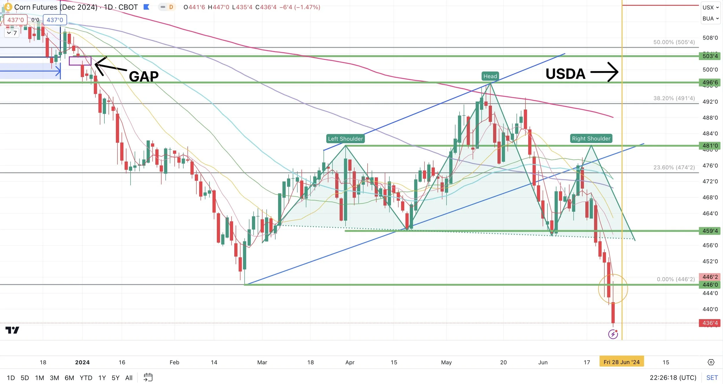 In 2014 on the June stocks report we dropped over -20 cents. We continued lower and by mid-July we were at $3.80 and our harvest low that year was $3.18.