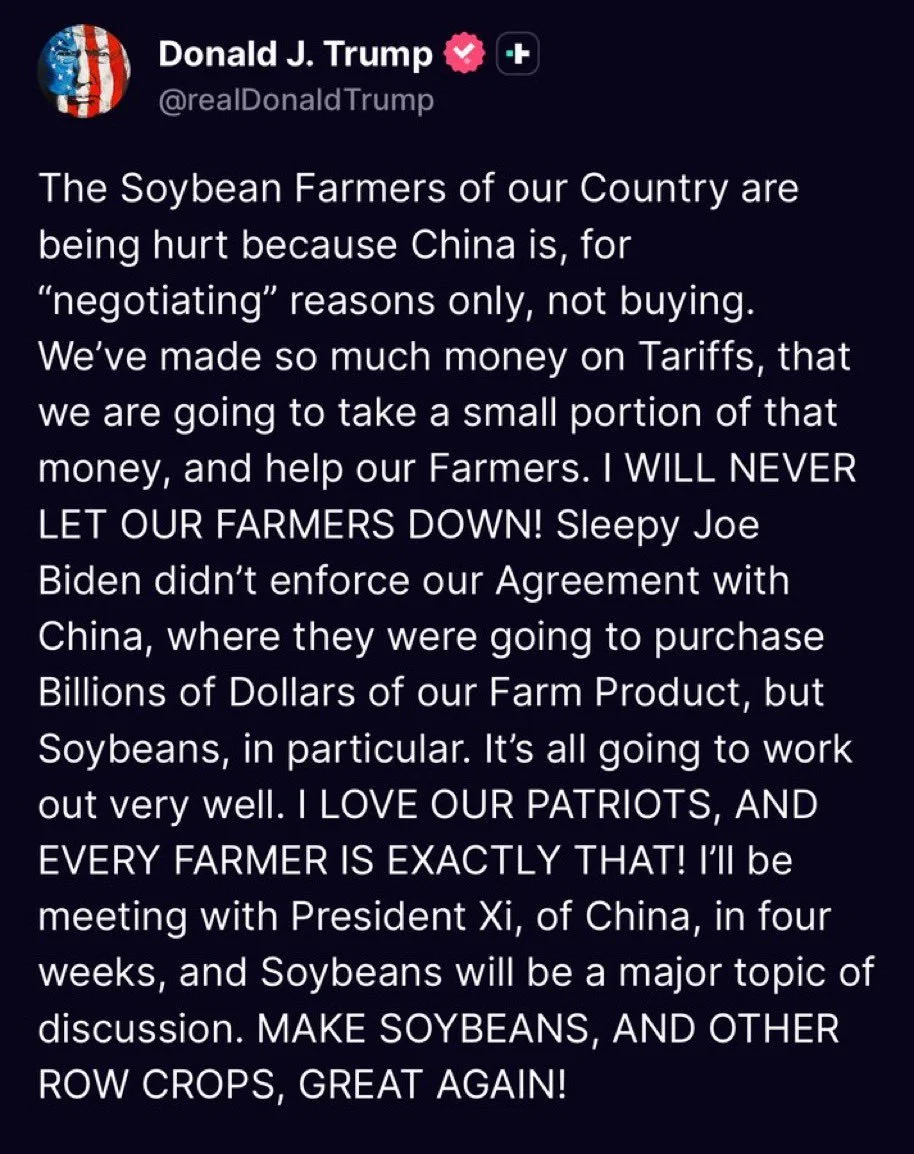 This is the 2nd time Trump has posted about soybeans since he stepped into office, and the first time since August 10th.