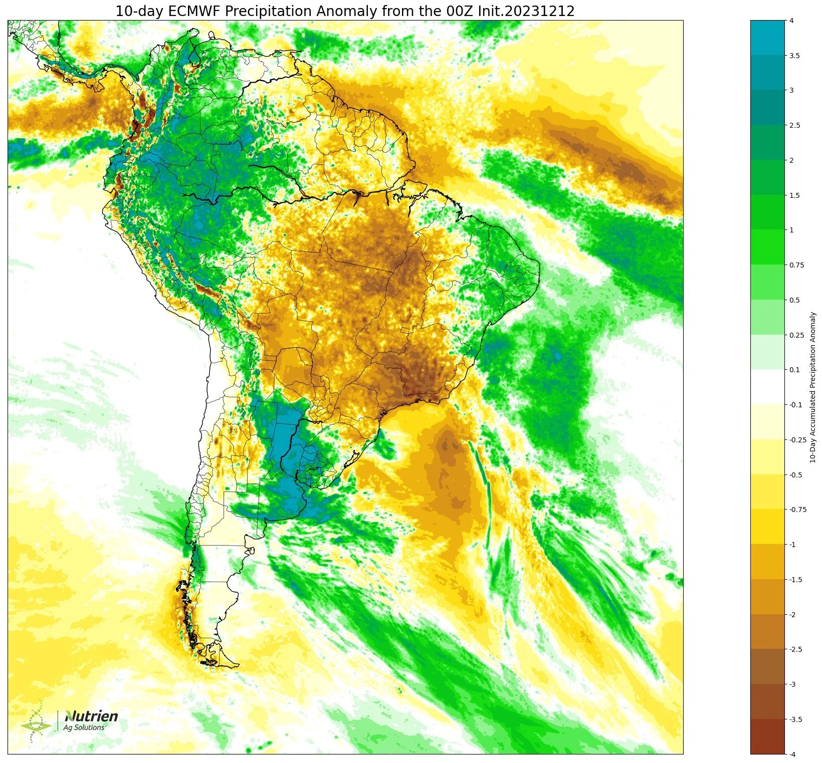 This next chart is from Karen Braun. It shows what the monthly precipitation would look like for Brazil using today's GFS rainfall forecast for December.