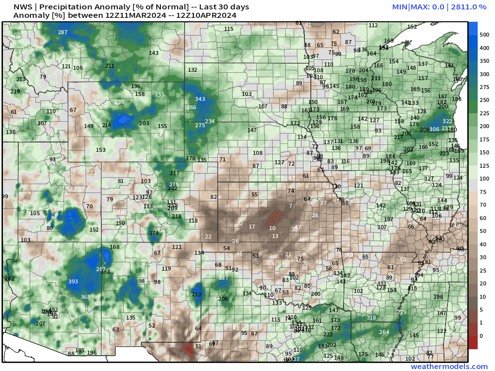Here is the last 30 days compared to normal. Most areas got good moisture, but Kansas completely missed out.
