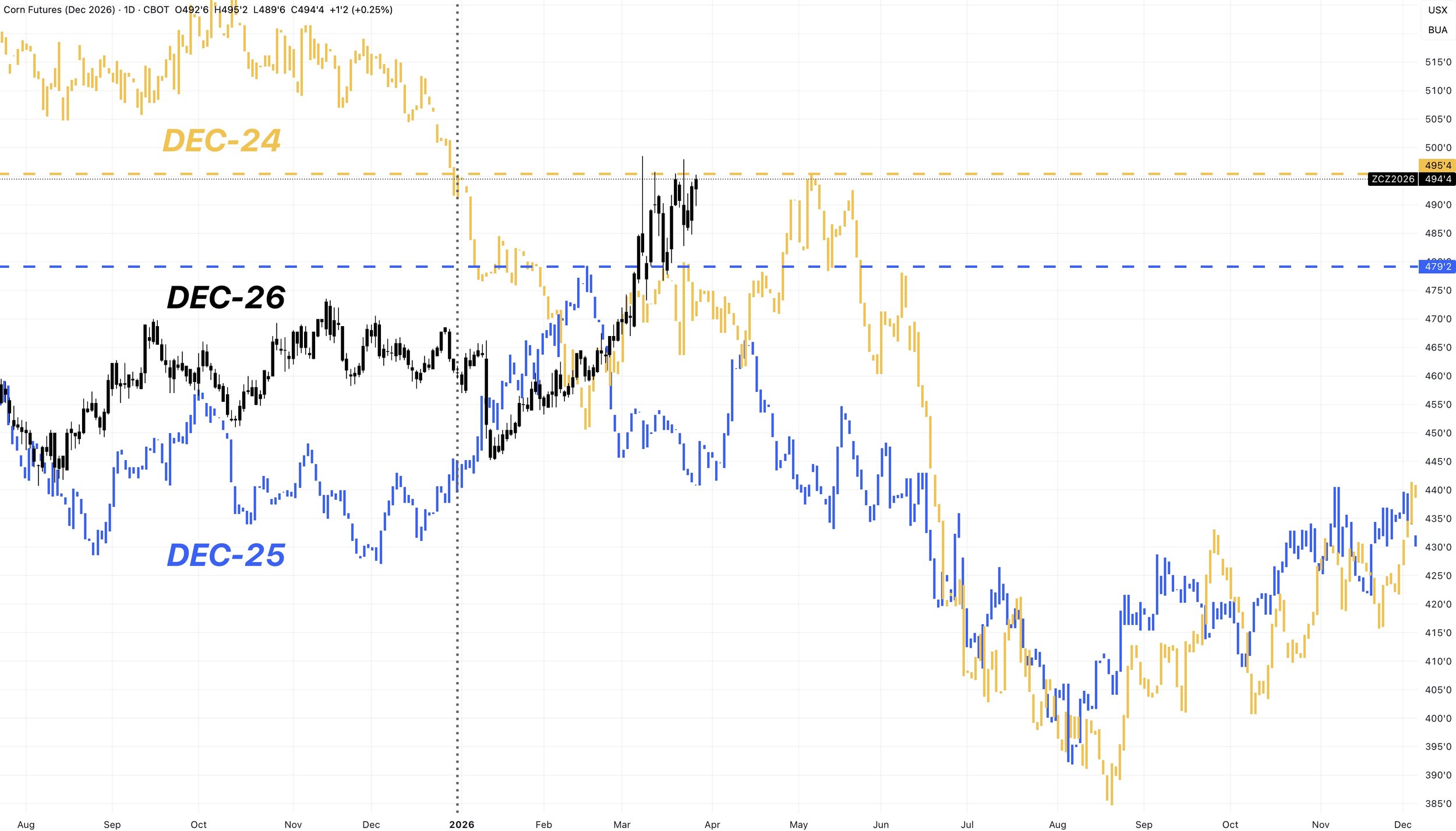 Dec corn is higher than it was all of 2025 and 2024.