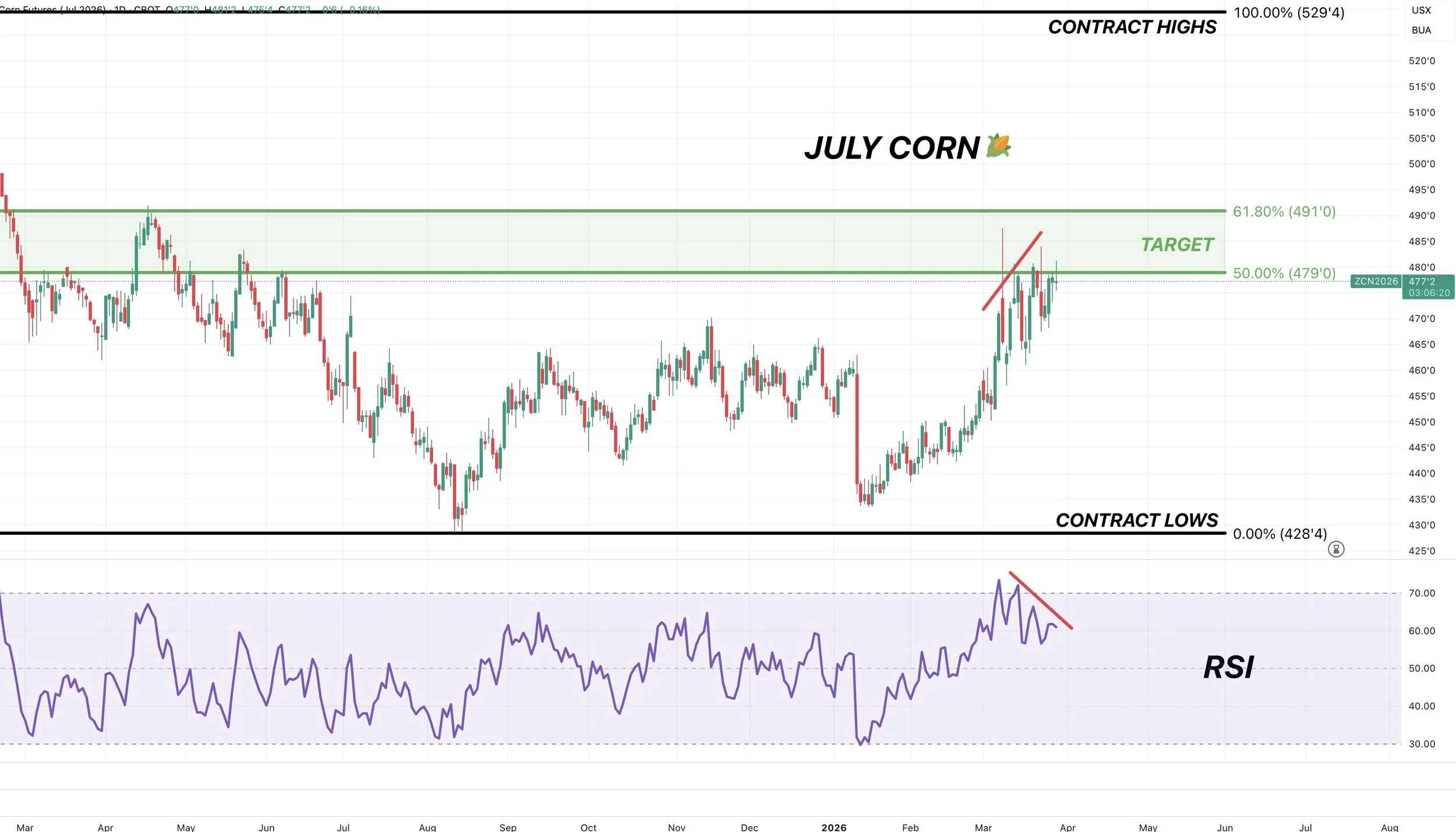 July corn is entering it’s golden zone from contract lows up to contract highs.