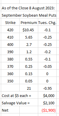 The plan was and is this: if the Soybean meal is high enough when these September options expire that the price highly likely to decline in the coming months, salvage what you can on the September puts in the last week or so of trading and buy one or two January or March puts at whatever strike price you can buy for $5 a ton, same as paid for the September puts.