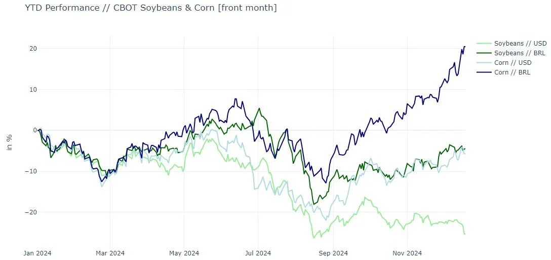 Below is a chart that shows corn & soybeans YTD performances in US Dollars vs corn & soybeans YTD performances in Brazilian Reals.