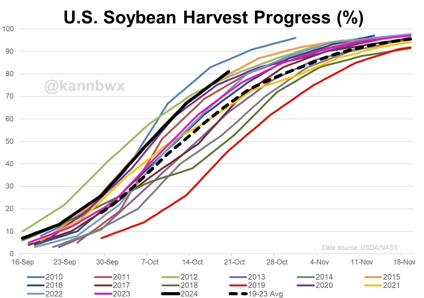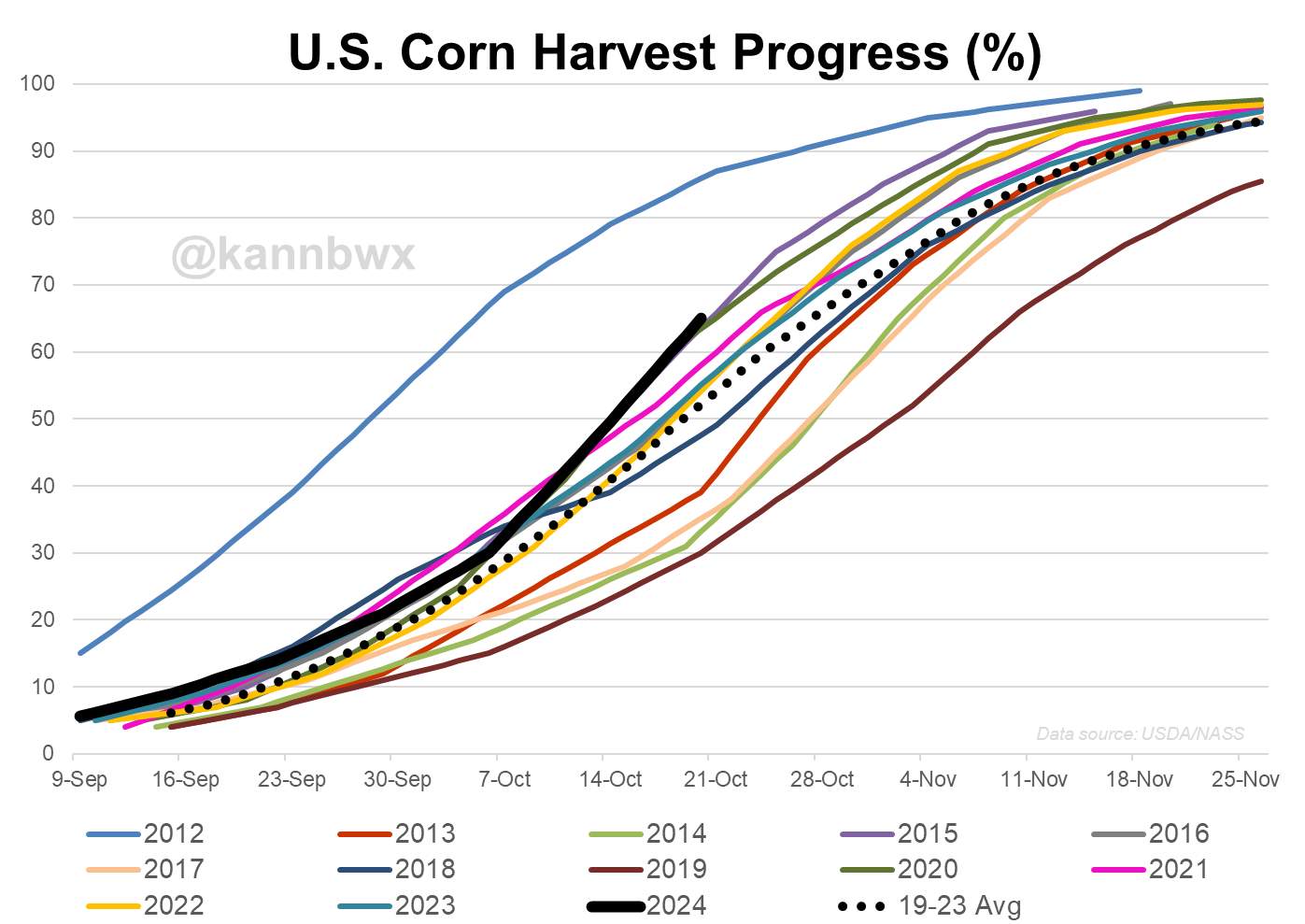 Harvest is now well past 50% complete. Which is good news for grain prices. As this means less "harvest pressure".
