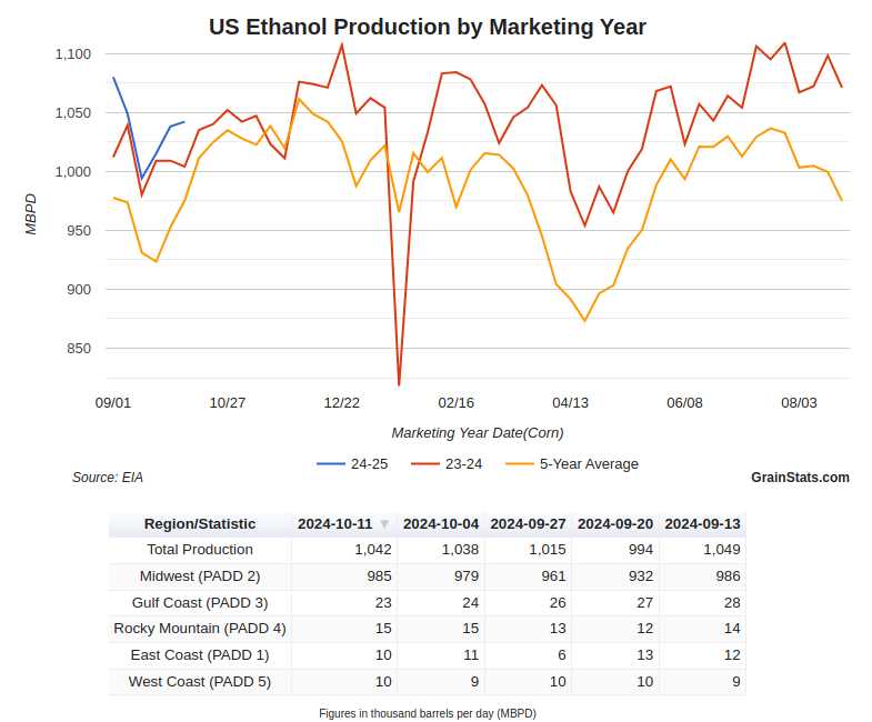 So we have very solid exports. We remain competitive globally. We have ethanol production well ahead of the USDA pace. They expect us to be below last year, but we are higher than last year currently.