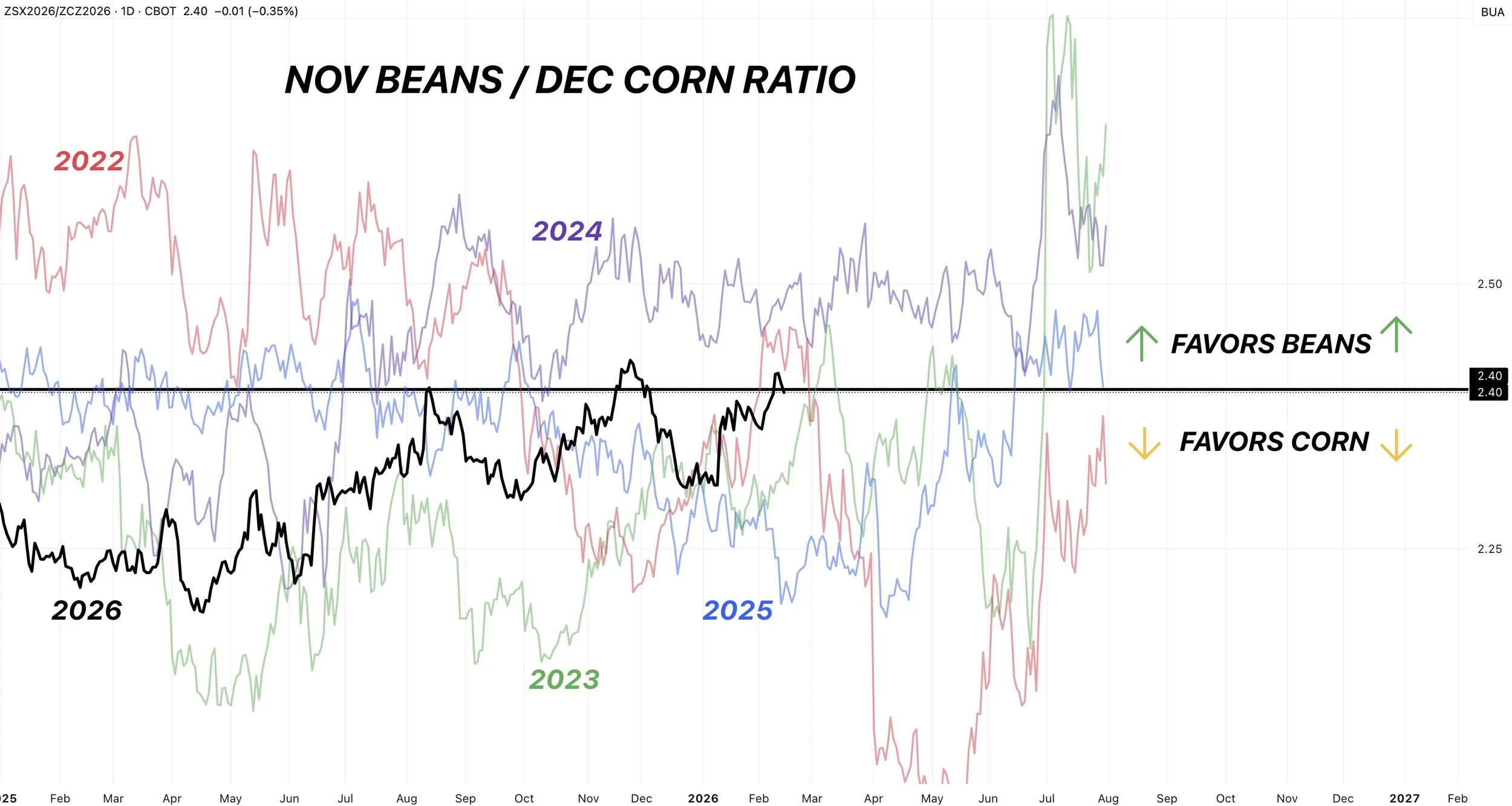 The ratio continues to slightly strengthen more towards being in favor of soybeans.