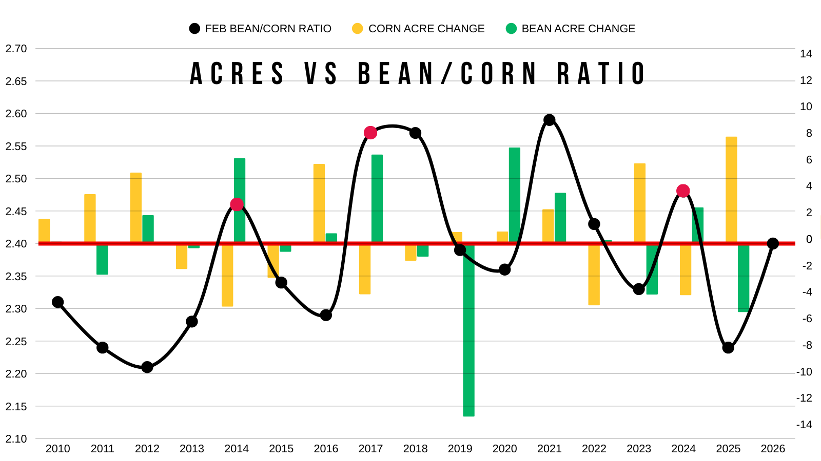 Here is the ratio overlayed on top of how corn and soybean acres have changed year over year.