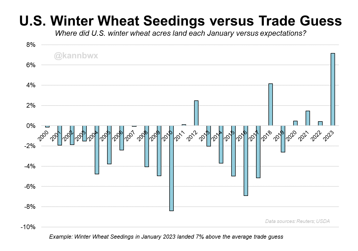 Wheat seedings is another one to look out for. This has brought some surprises over the years. Last year the market was shocked as they came in +7% higher than the expectations.