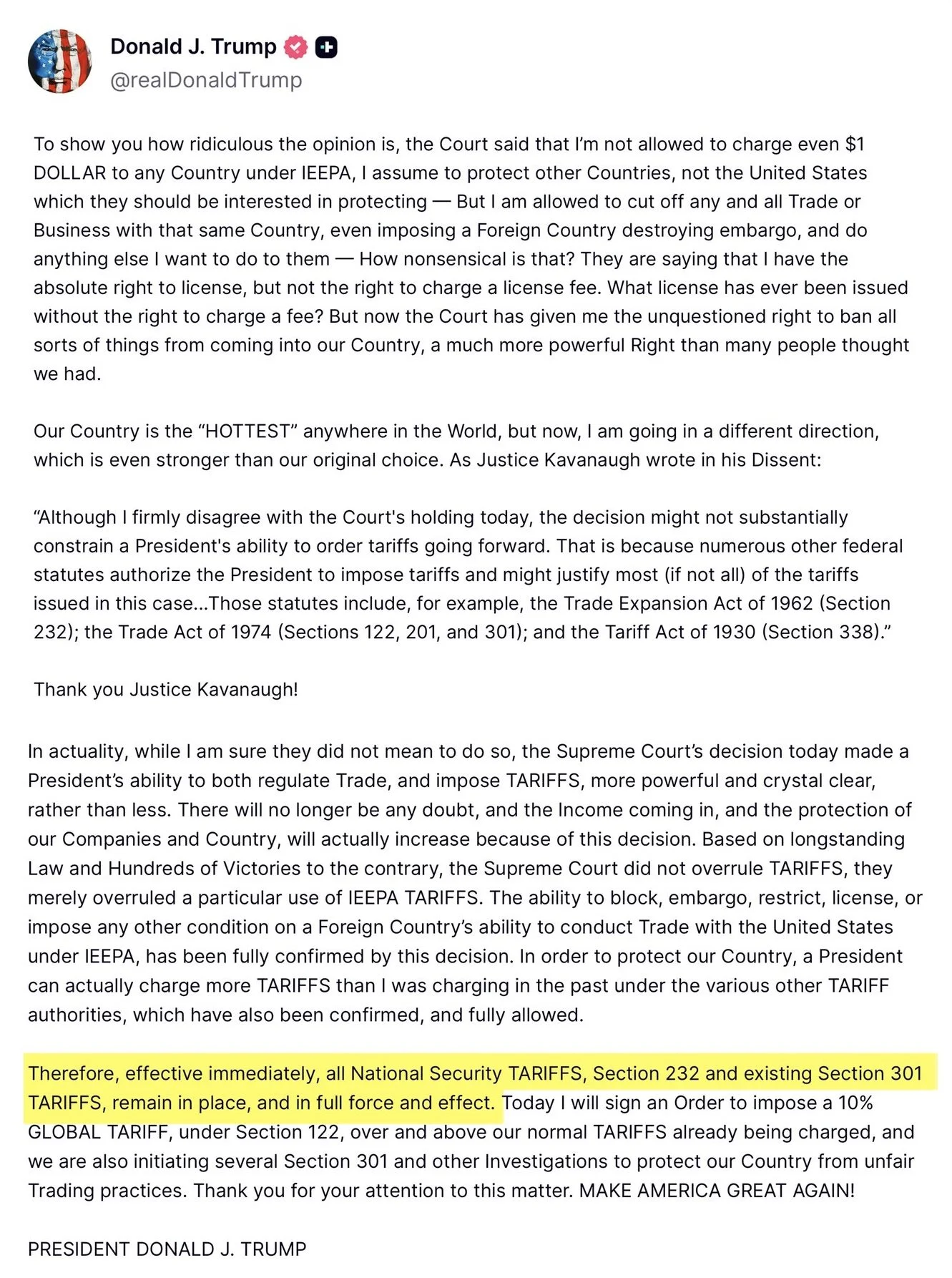 "Tariffs, section 232 and existing section 301 tariffs, remain in place, and in full effect. Today I will sign an order to impose a 10% global tariff, under section 122."