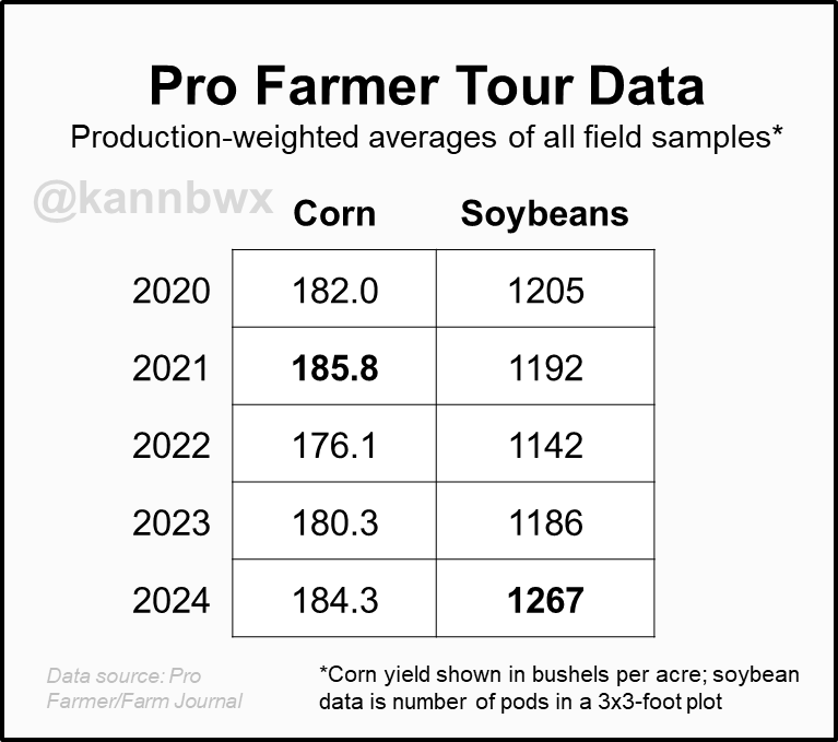 "This will be the worst finish for crops since 2012. I haven’t seen corn turn this early since that year. It will ding kernel size & prevent really high TW. Pod count is higher on beans but bean size will be very small. Still 178 on corn but beans maybe 51-52."
