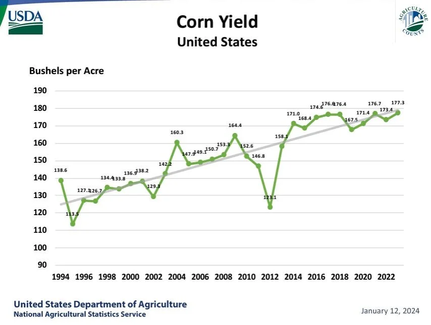The USDA trendline yield has been stagnant for nearly a decade. With yields really topping out the past 6 years. We have struggled to get a number above 176.